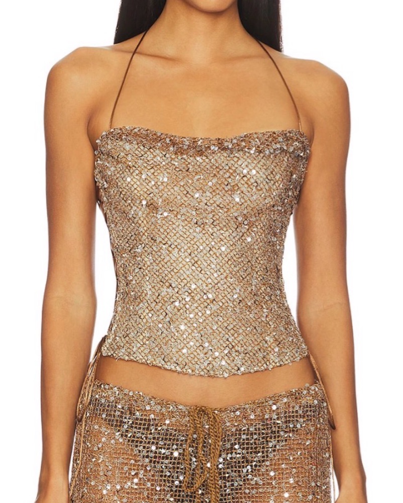 Halterneck tie closure, side lace-up detailing with tie closures, sequin detailing, crochet fabric