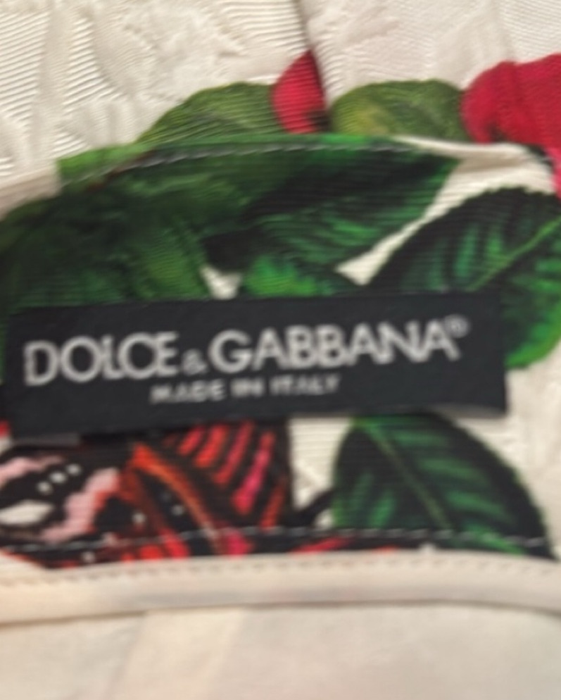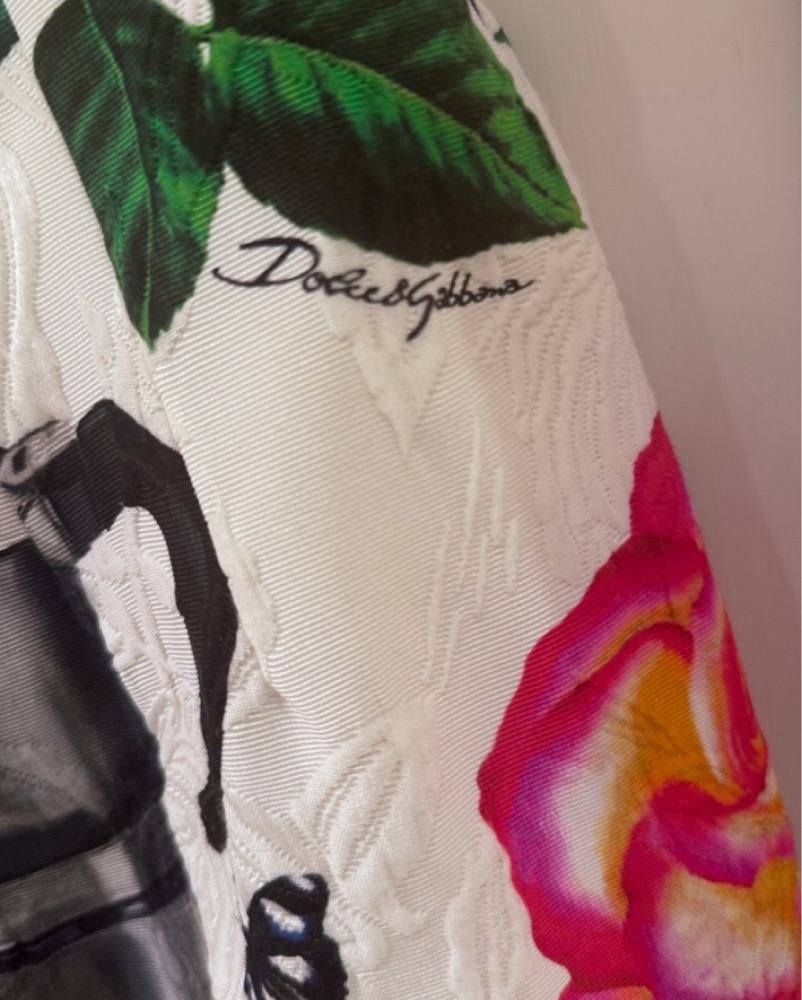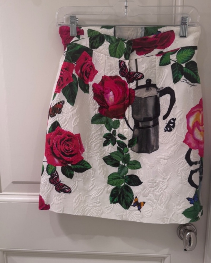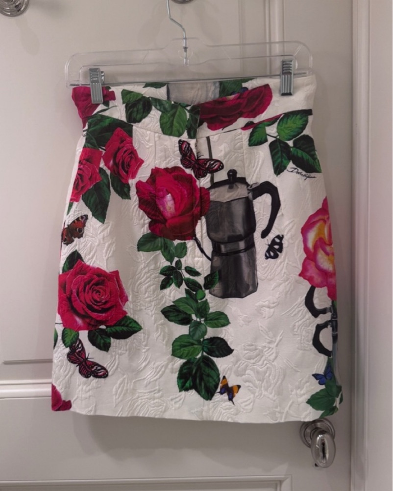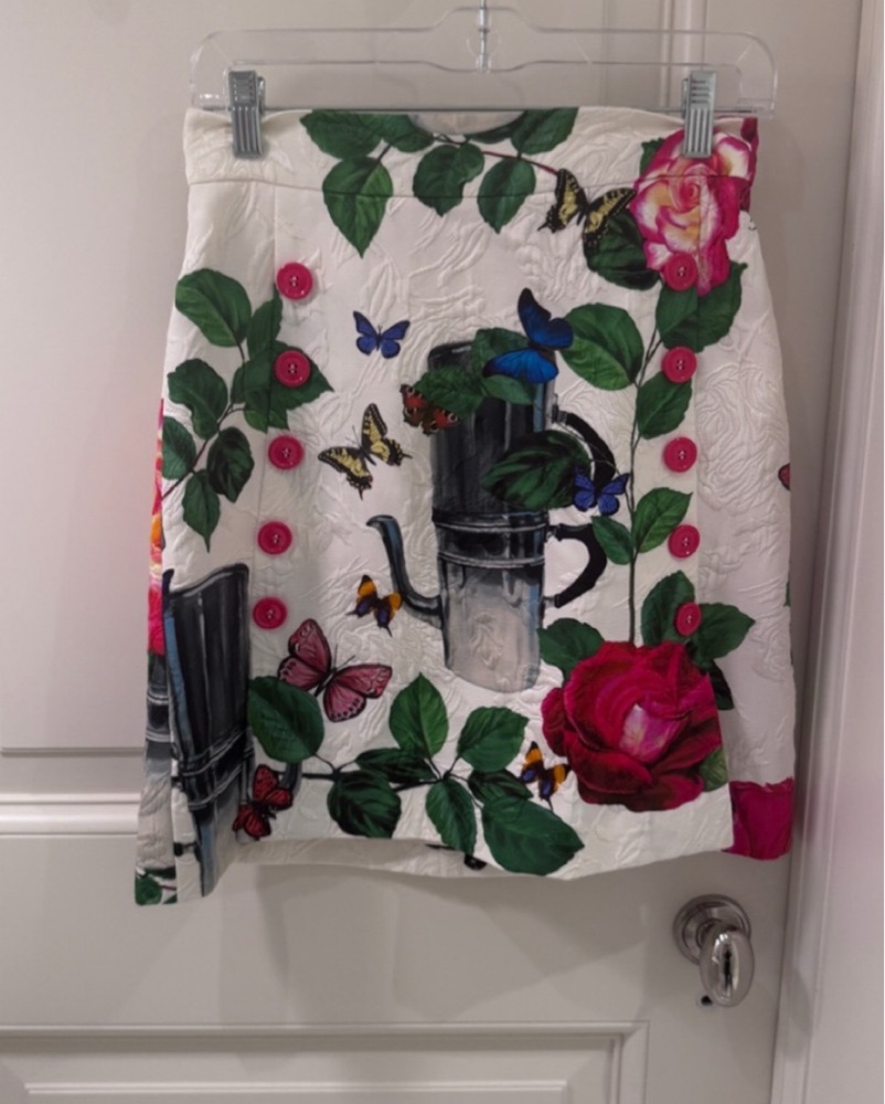 This bold and vibrant Dolce & Gabbana skirt is perfect for a chic, summer event. The whimsical rose and butterfly print creates a feminine, yet fashion-forward look.