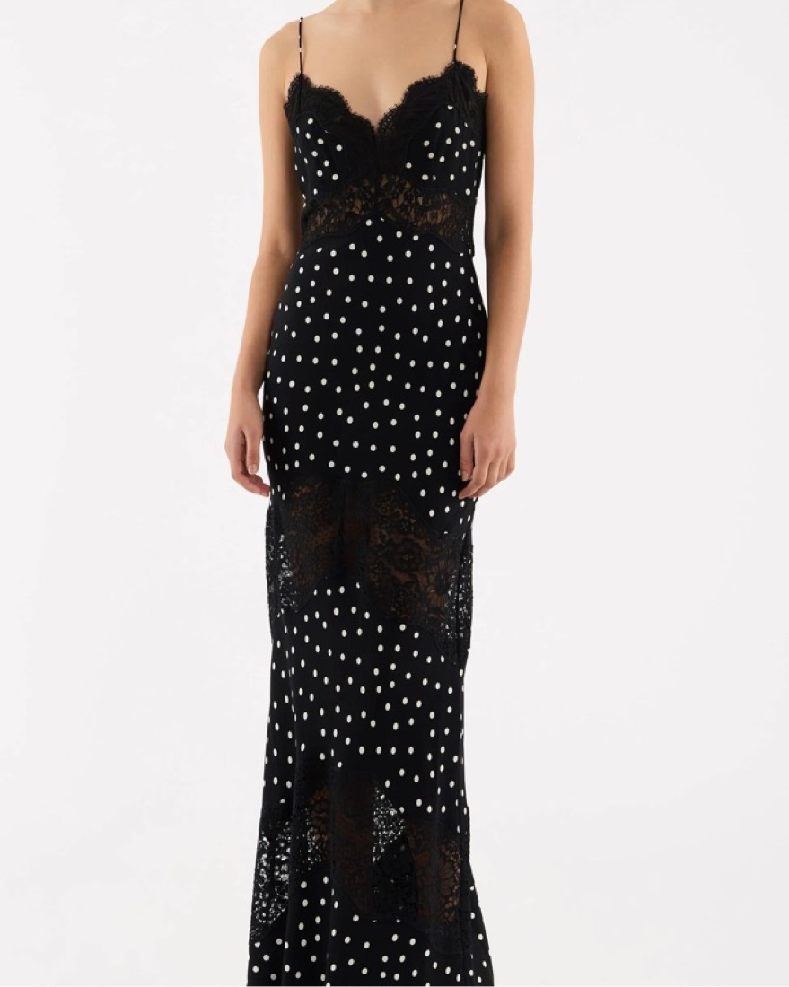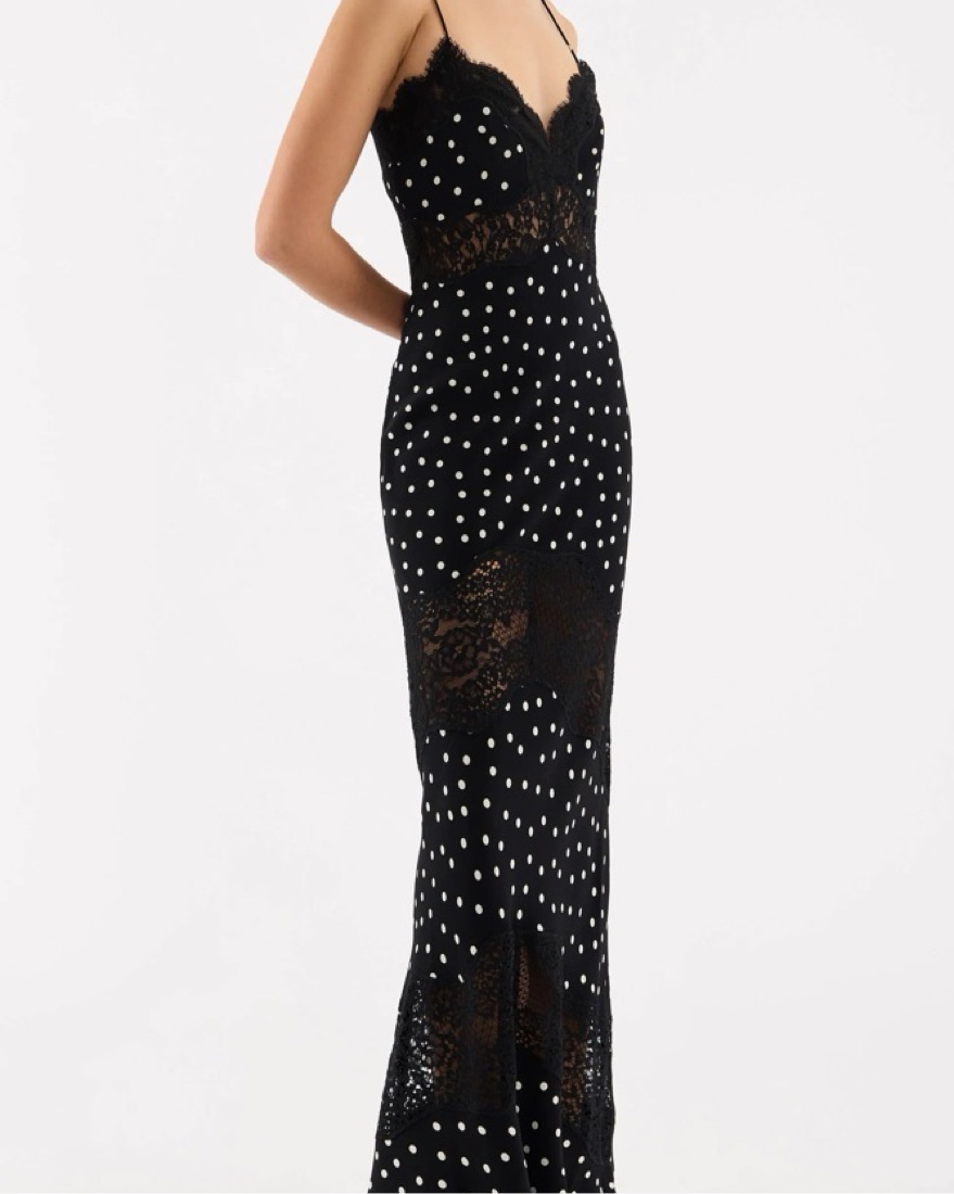 The Celyn Maxi Dress is a captivating dress, exuding timeless sophistication and style. Featuring an alluring V-neckline with lace trims, the silhouettes flattering draped maxi length skirt creates a gorgeous shape. Worn once. Wedding guest dress. Formal dress