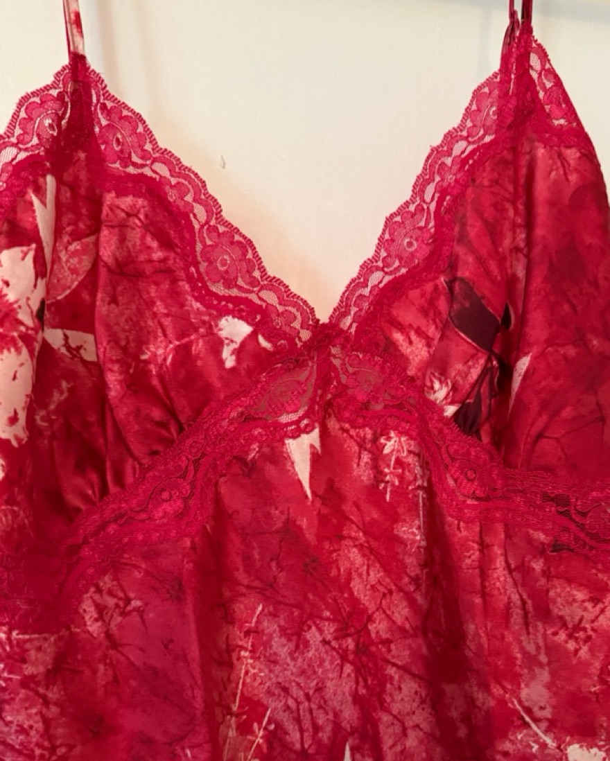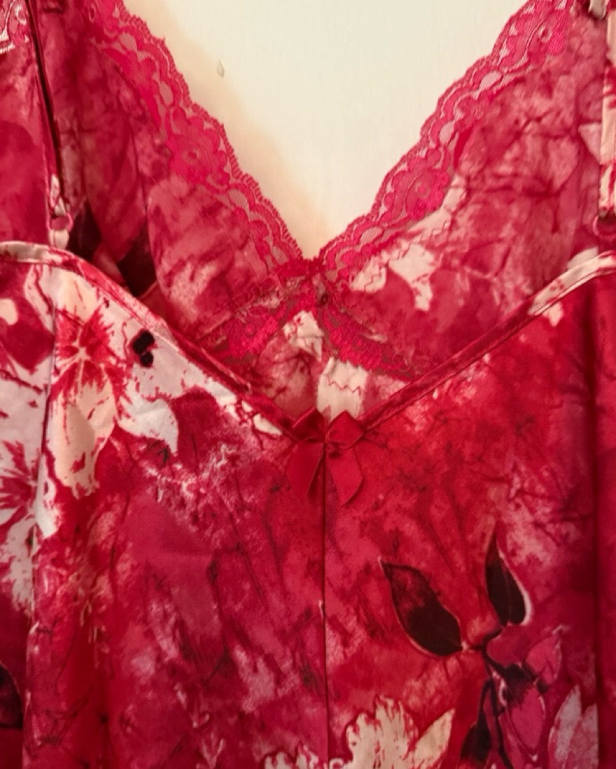 This gorgeous floral lace sleepwear dress is perfect for a romantic night in or as loungewear. The bold red color and delicate floral pattern create a luxurious and feminine look. Lace at neckline and side slit- slit is only on one side. The color is not a true red - has a hint of pink.
