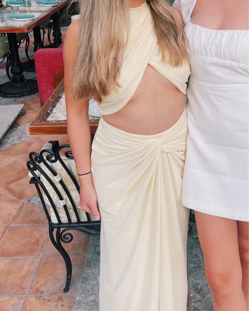 Super cute, baby yellow two piece set. Mid to long skirt and crop top, vintage. Sunset, beach, tropical, Greek, bachelorette vibes