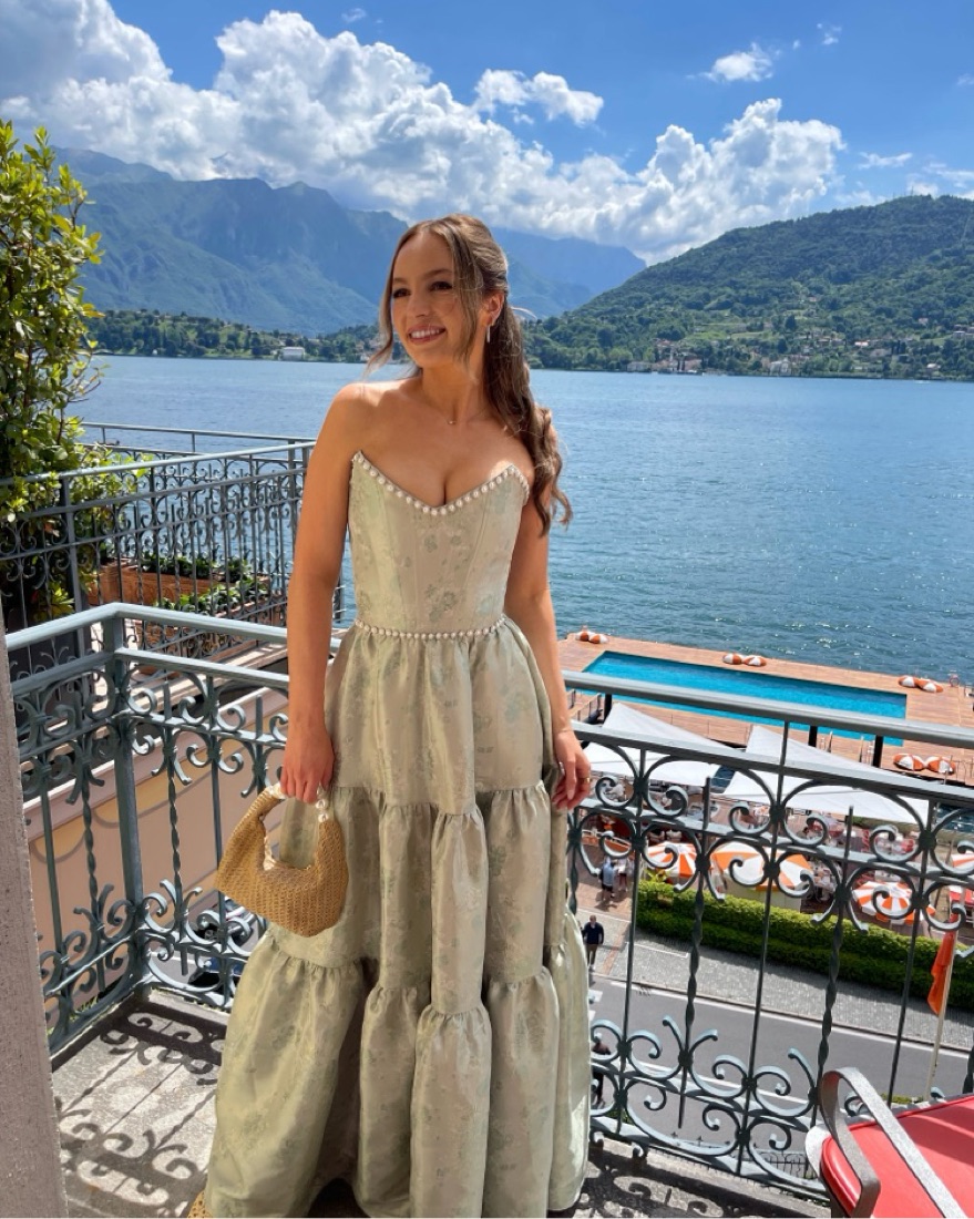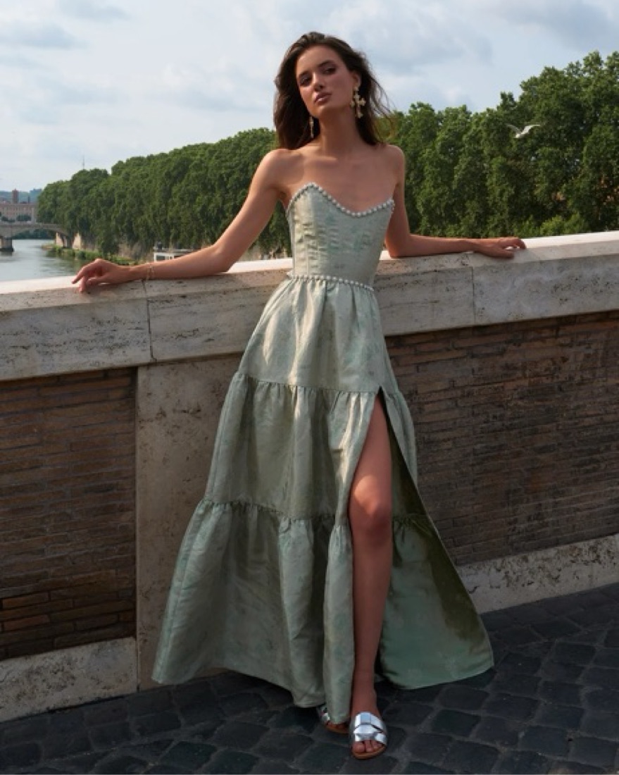 The Vivian Dress in Sage Windsor Brocade from V Chapman. Corset top was my faborite part! Got so many compliments on this dress when I wore it in Italy - perfect for formal weddings and occasions. Im 5’9” and wear a size 6. More details can be found on their website!