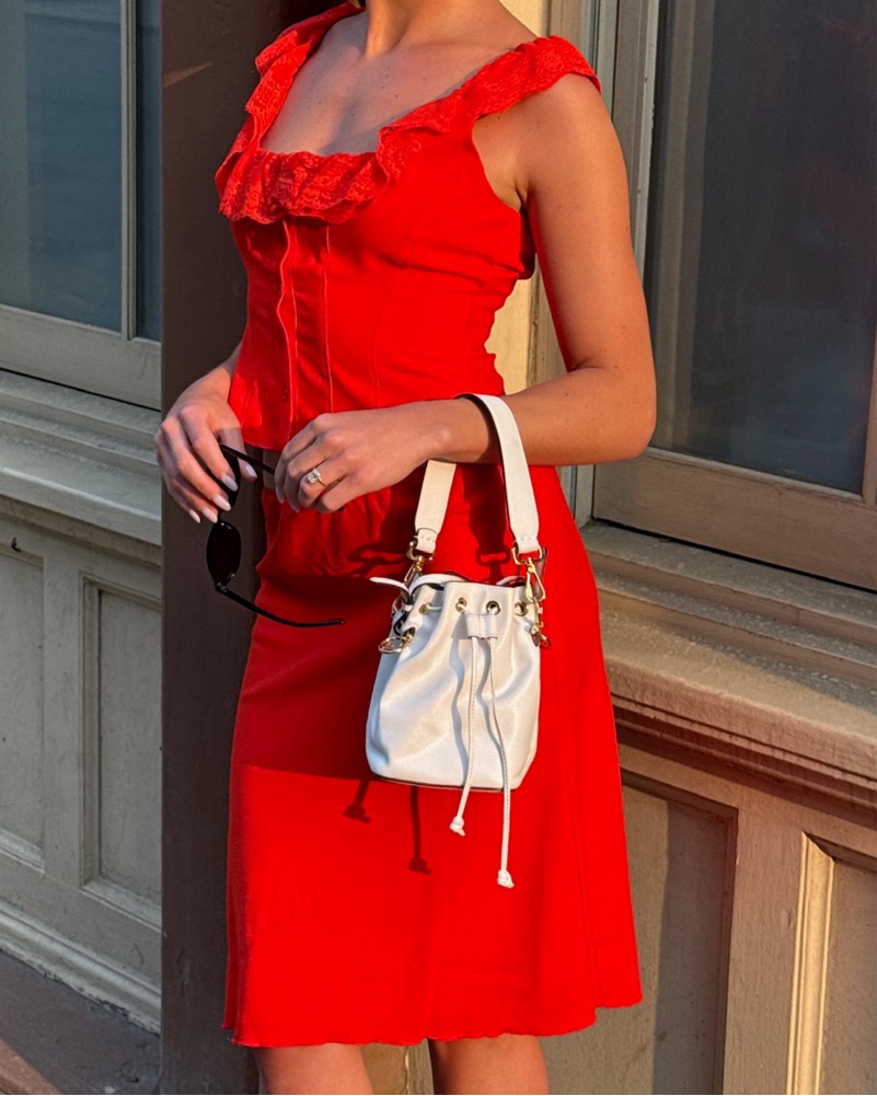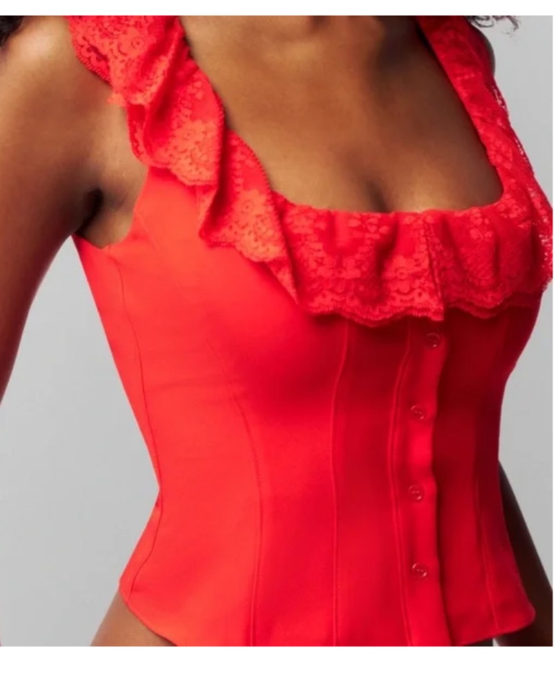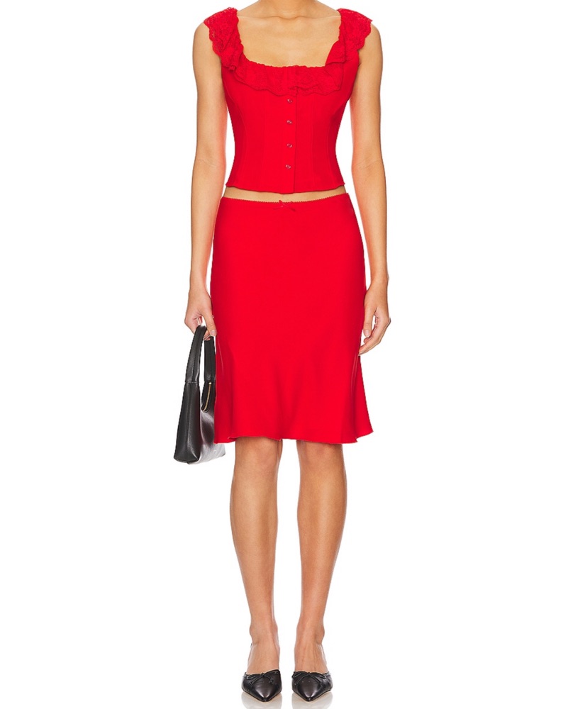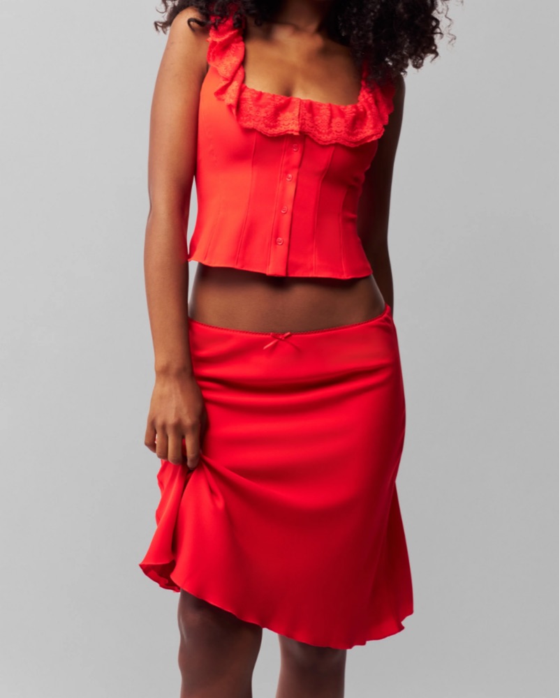 This eye-catching red outfit is perfect for a night out or special event. The ruffled crop top and flared skirt create a flirty, feminine look that is sure to turn heads.