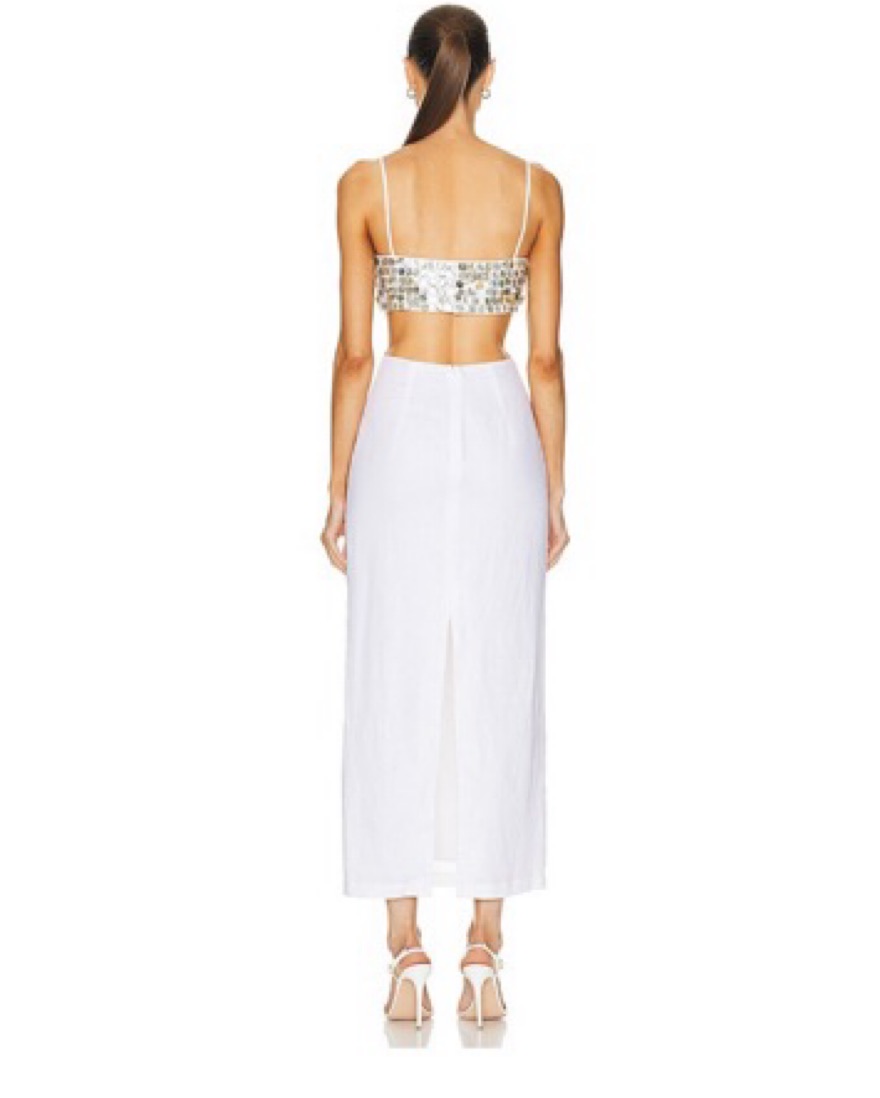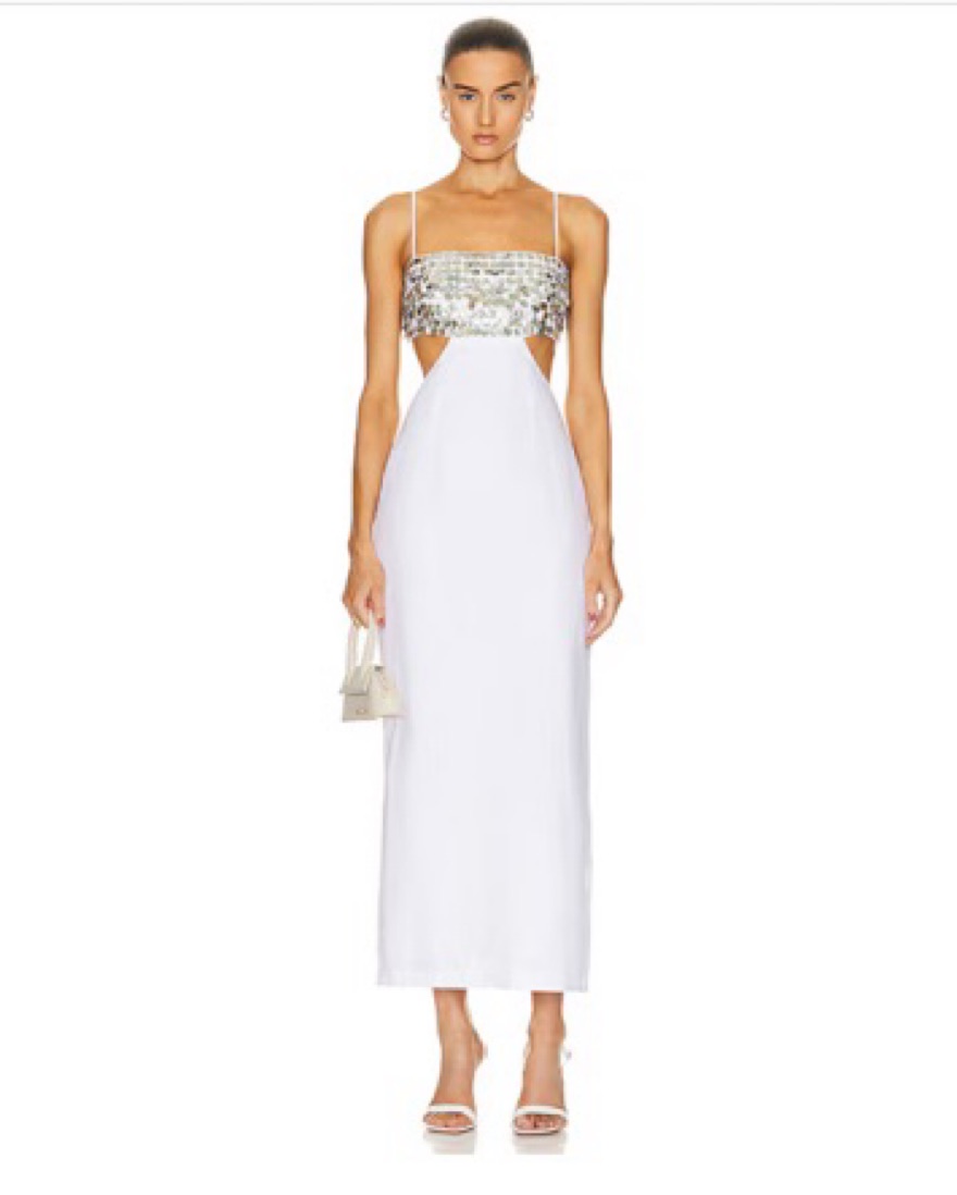 Sold out everywhere! The perfect bridal dress or festive white summer party dress. Wear for engagement party or to the hamptons for the weekend. NOTE: the sequins are done by hand. The dress is in great condition w only 3-4 sequins missing that are not noticeable when worn. Refunds will not be given