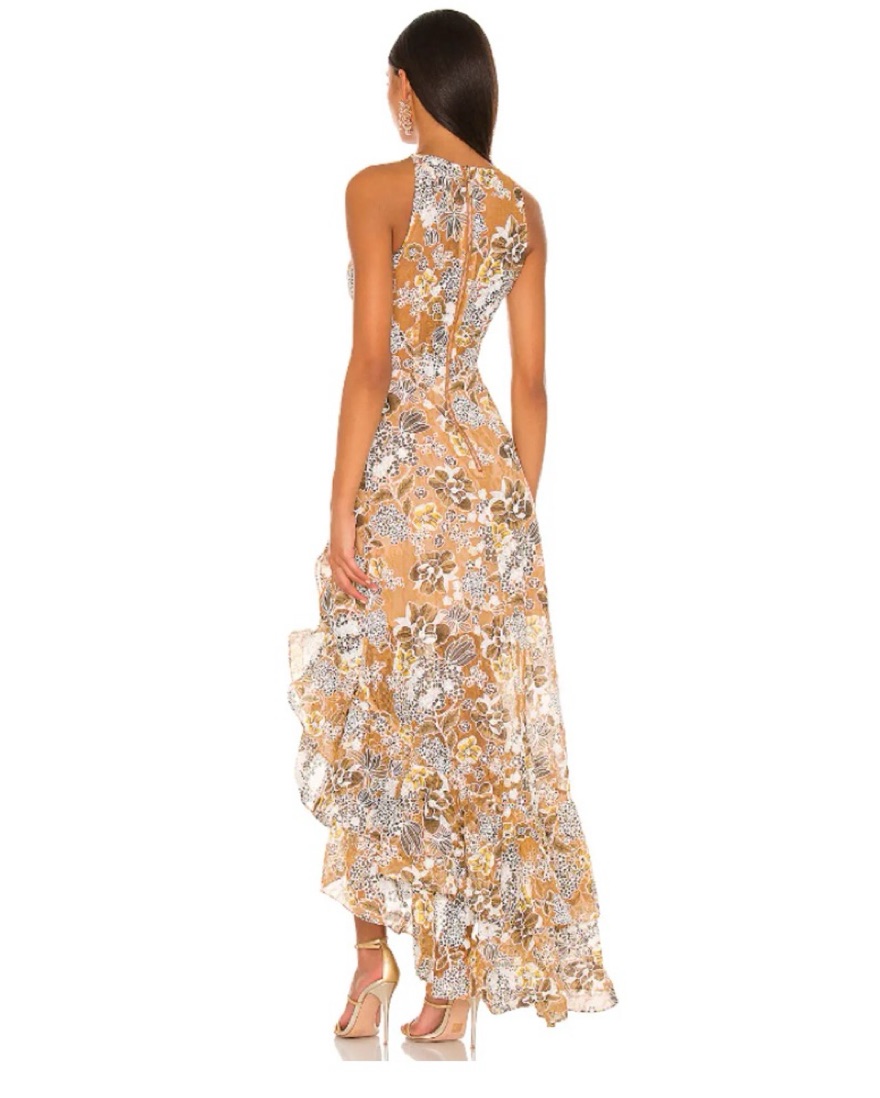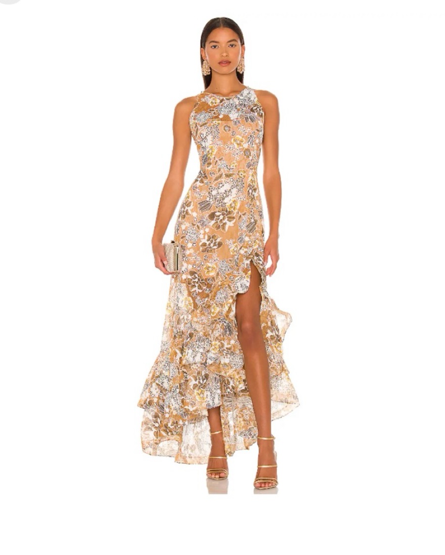 Gorgeous gold and brown ruffle lace fabric dress. The skirt has a slit, goving this dress a modest yet sexy appeal. Great for any special occasion, wedding or black tie event! Super lightweight and easy to dance all night in.