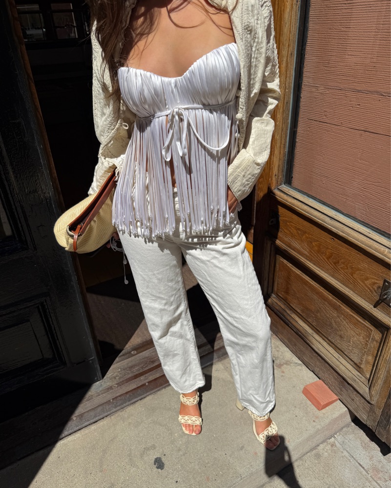 Incredible vintage top. bustier top, featuring signature fluid fringe detailing and delicate crystal bead embellishments. Designed to make a statement, this piece blends soft structure with movement for an elegant yet bold silhouette. Included but not noticeable “flaws”