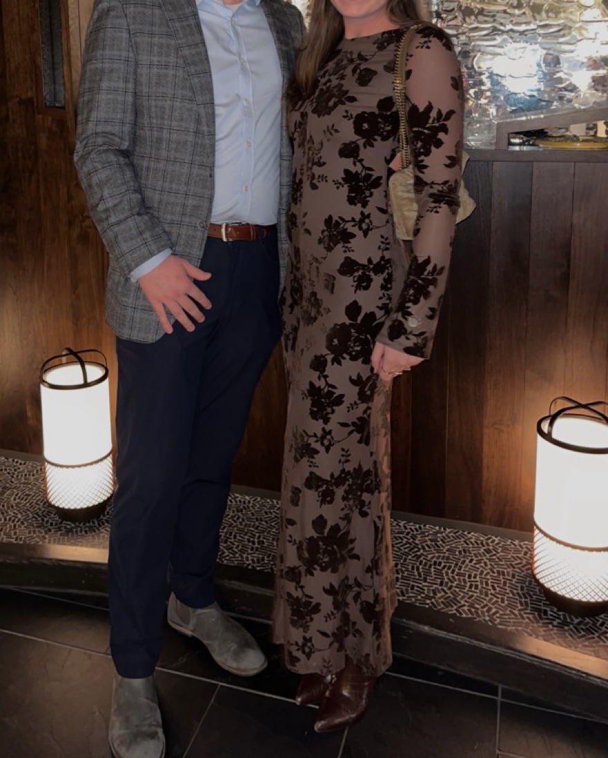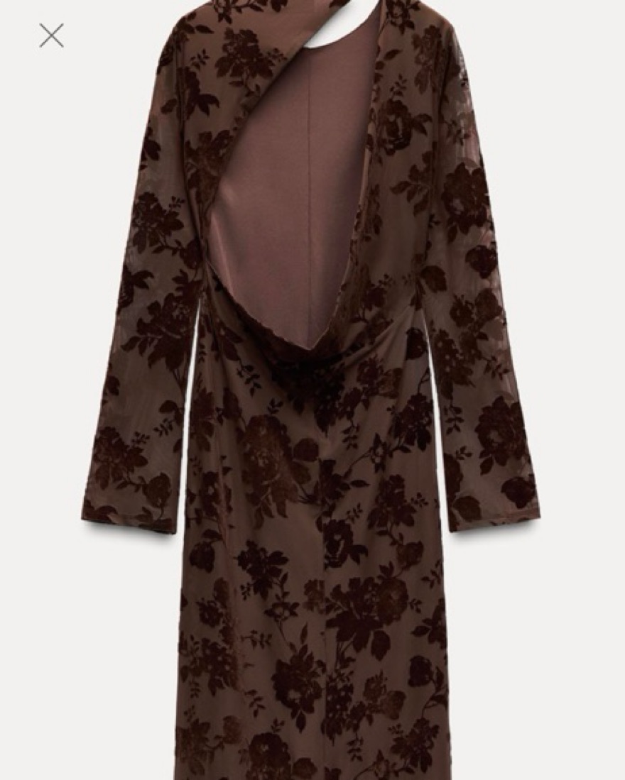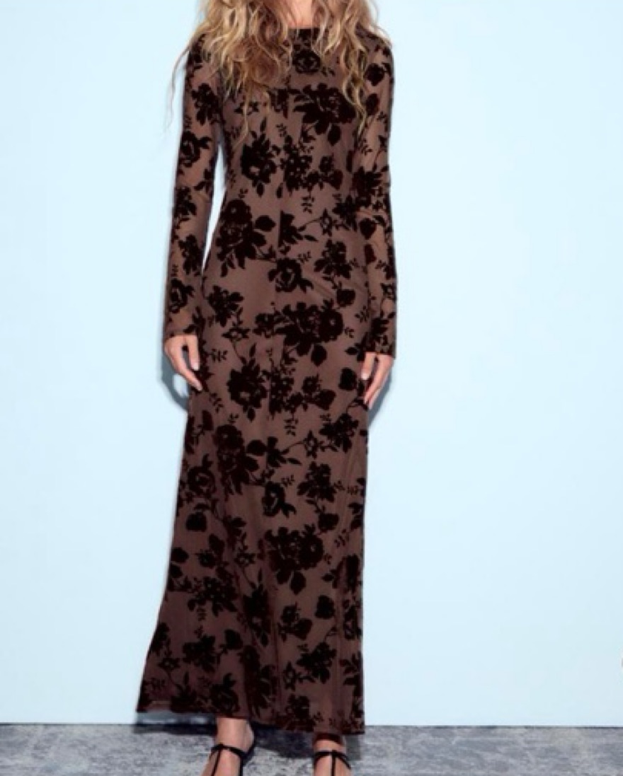 long tulle flocked dress from Zara. Long dress with round neck and long sleeves. Flocked floral details. Open back with flowy neckline and button closure. Interior lining.