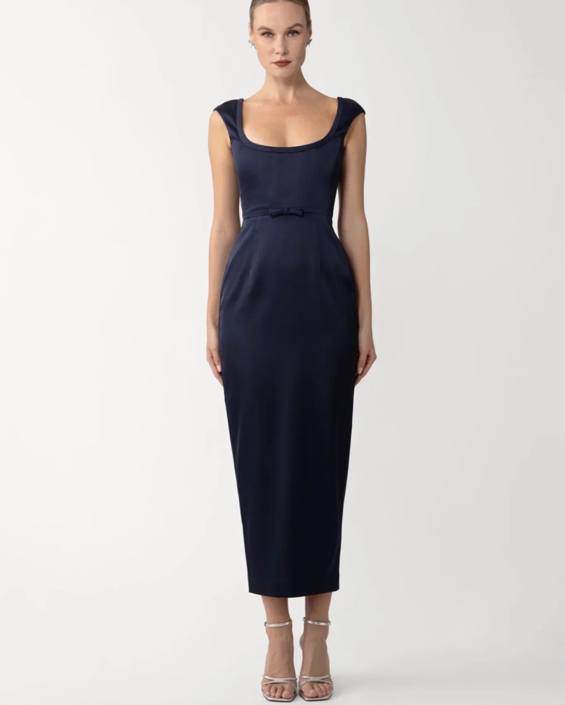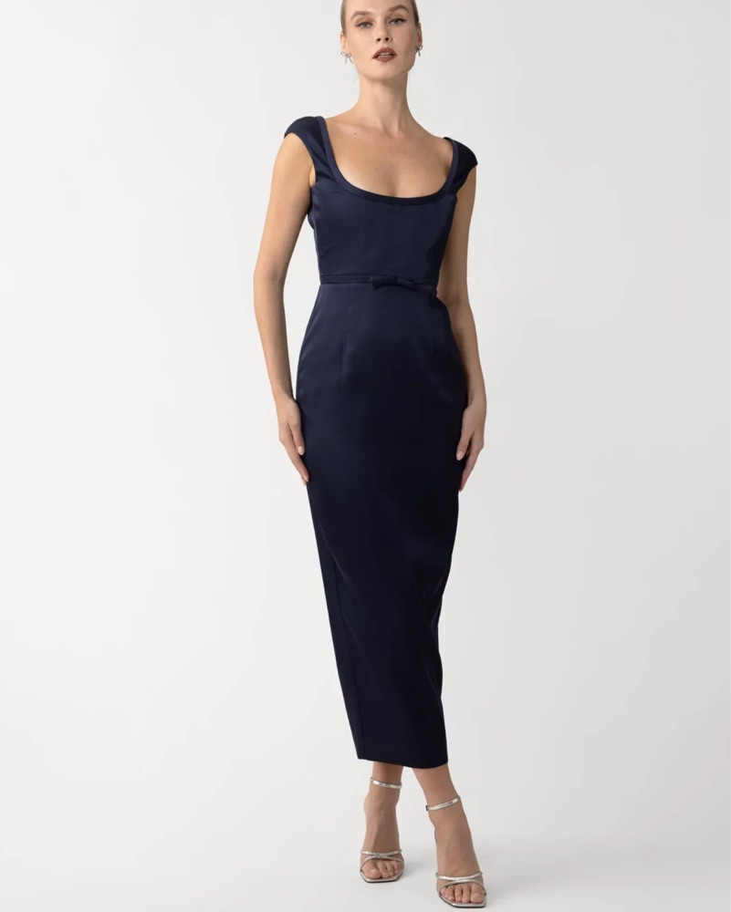 Models are ~5’9” for midi length; fits more like maxi length for 5’4”. The Meadow Dress is cut from lustrous satin in a fitted midi silhouette. Featuring a soft scoop neckline and subtle cap sleeves, it’s finished with a delicate bow at the waist for a romantic touch.