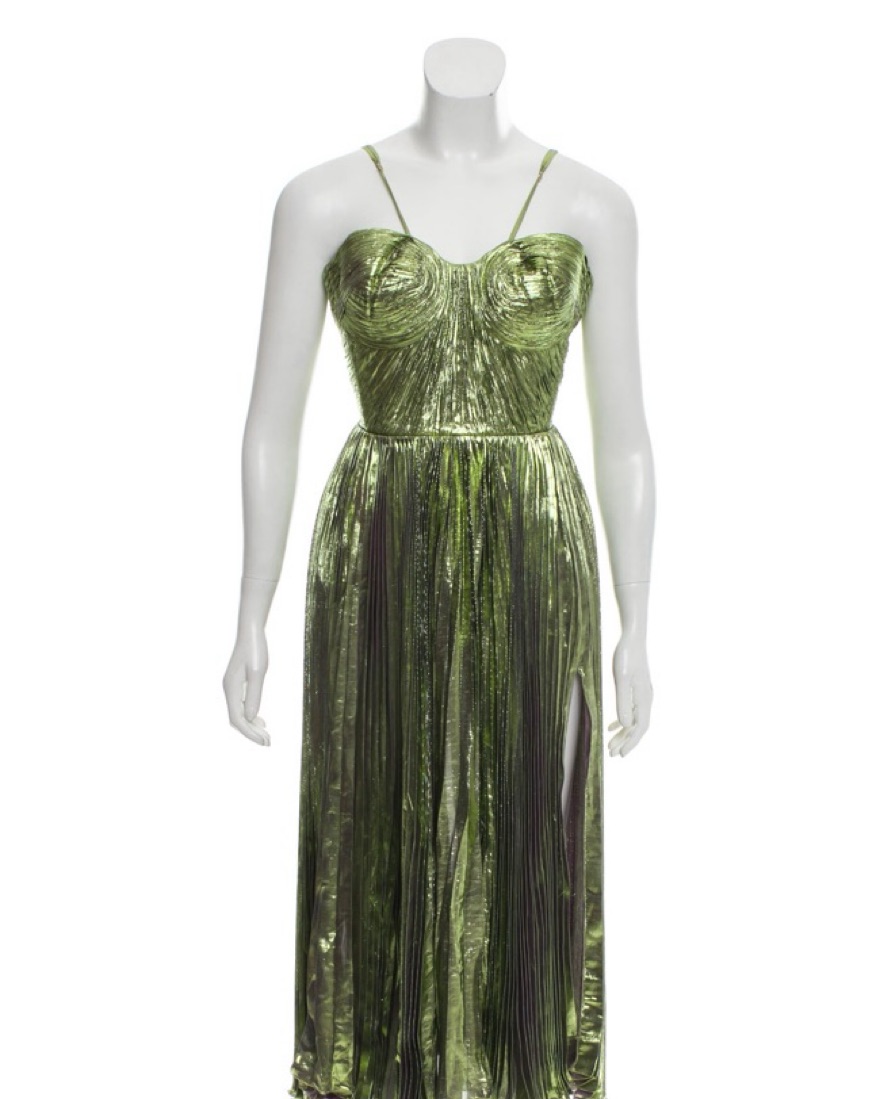 Beautiful and shiny green dress with molded bust and pleated bottom. The dress has an inner bodysuit for coverage. Bust: 30"