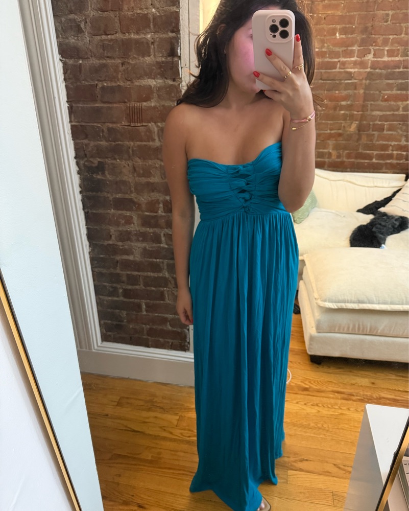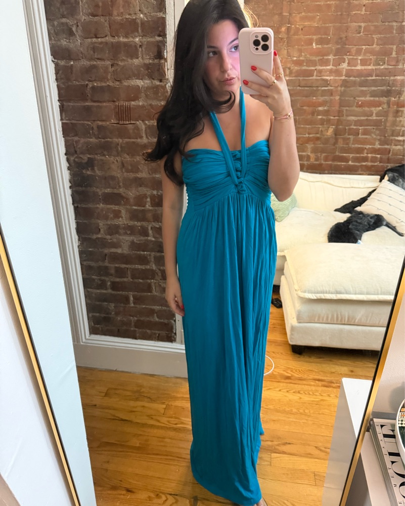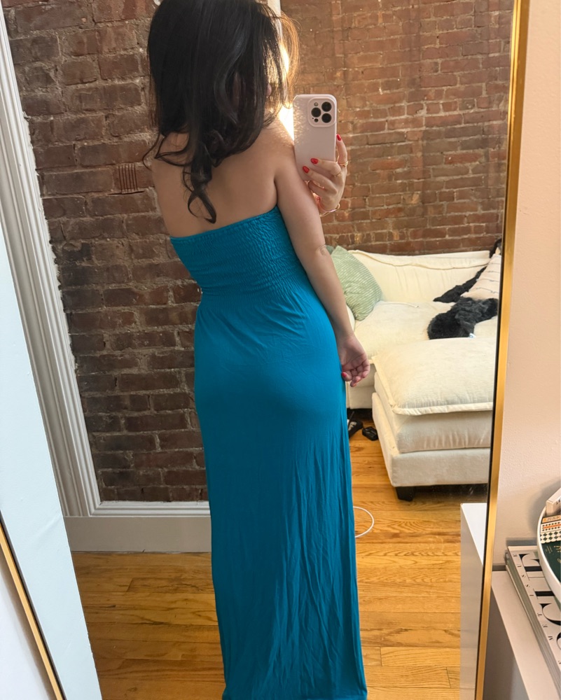 Multi style turquoise maxi dress. Can be dressed up or down. Soft cotton material