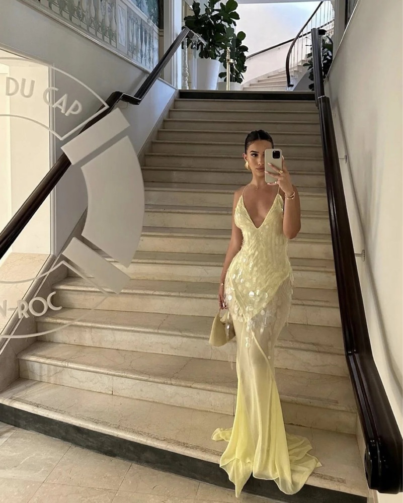 Butter yellow color, perfect for wedding guest. Size small would fit both small and medium. If you’re xs, I also have xs on my page of this same dress. Brand new
