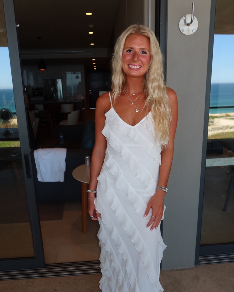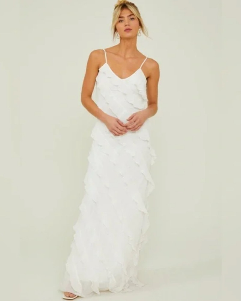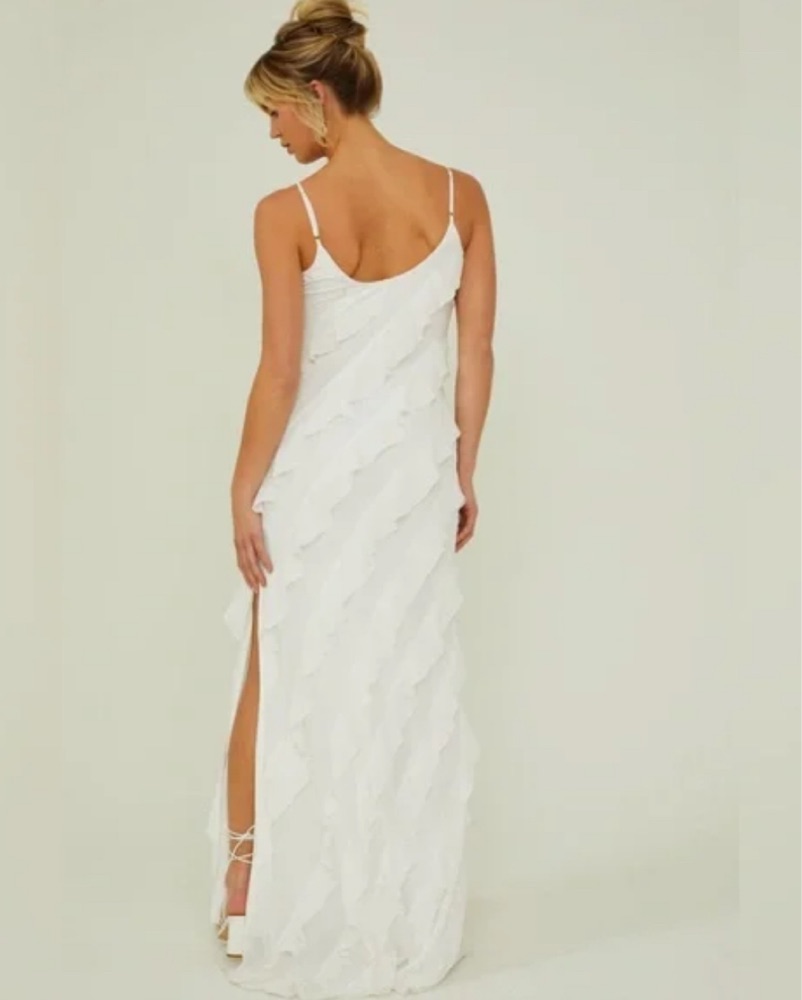 This elegant white maxi dress is perfect for a formal occasion. The flowing ruffles and high slit create a stunning and flattering silhouette.