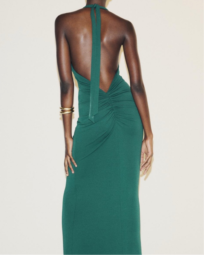 This figure-flattering emerald green gown is perfect for a special occasion such as a formal event or black-tie wedding. The ruched detailing and halter neckline create a chic and sophisticated look.