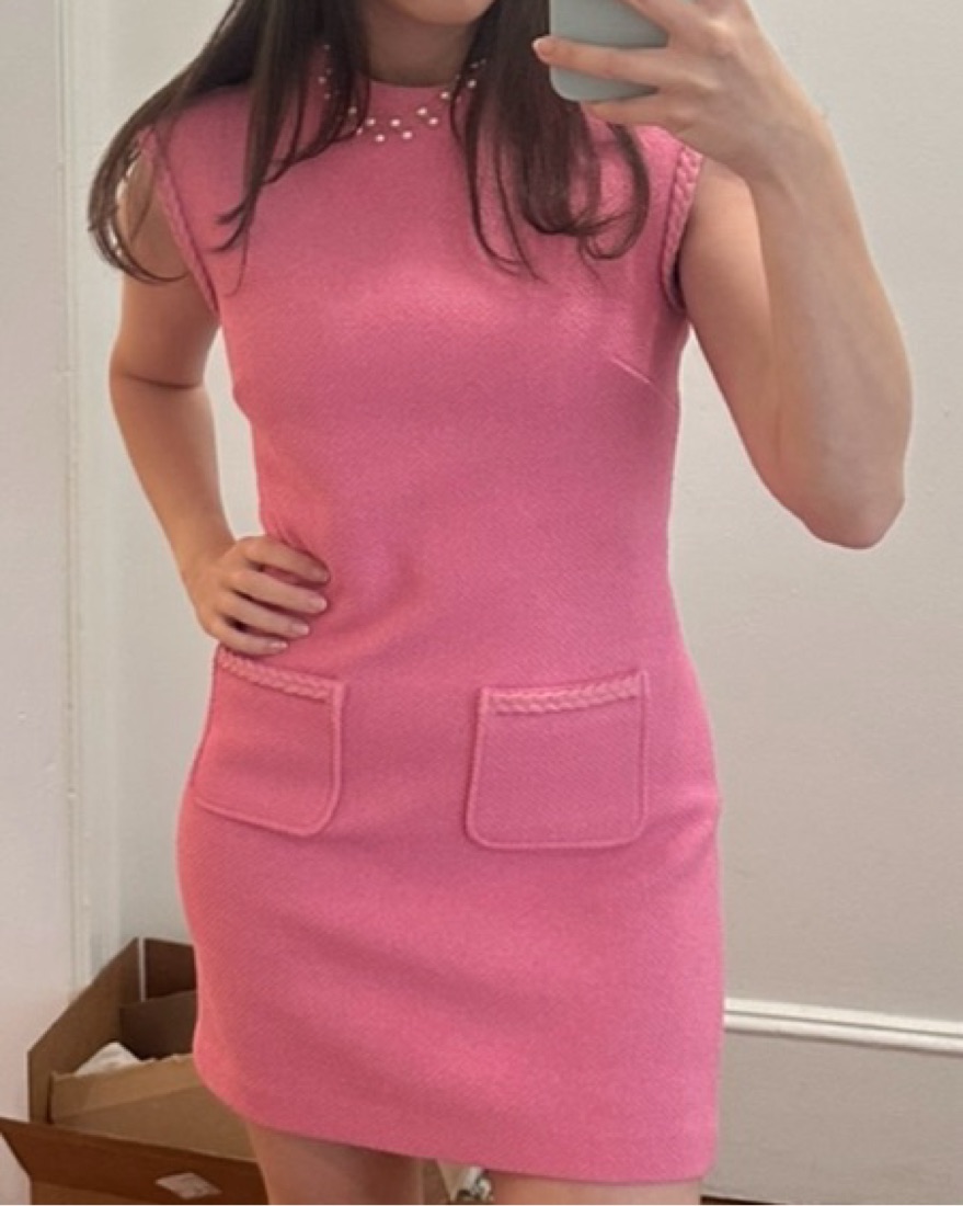 This tweed pink mini dress with pockets is perfect for a night out, special occasion, or even work with a blazer. Fits true to size. Size 1/S.