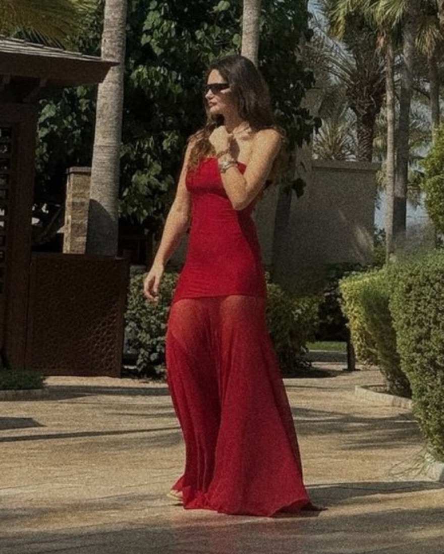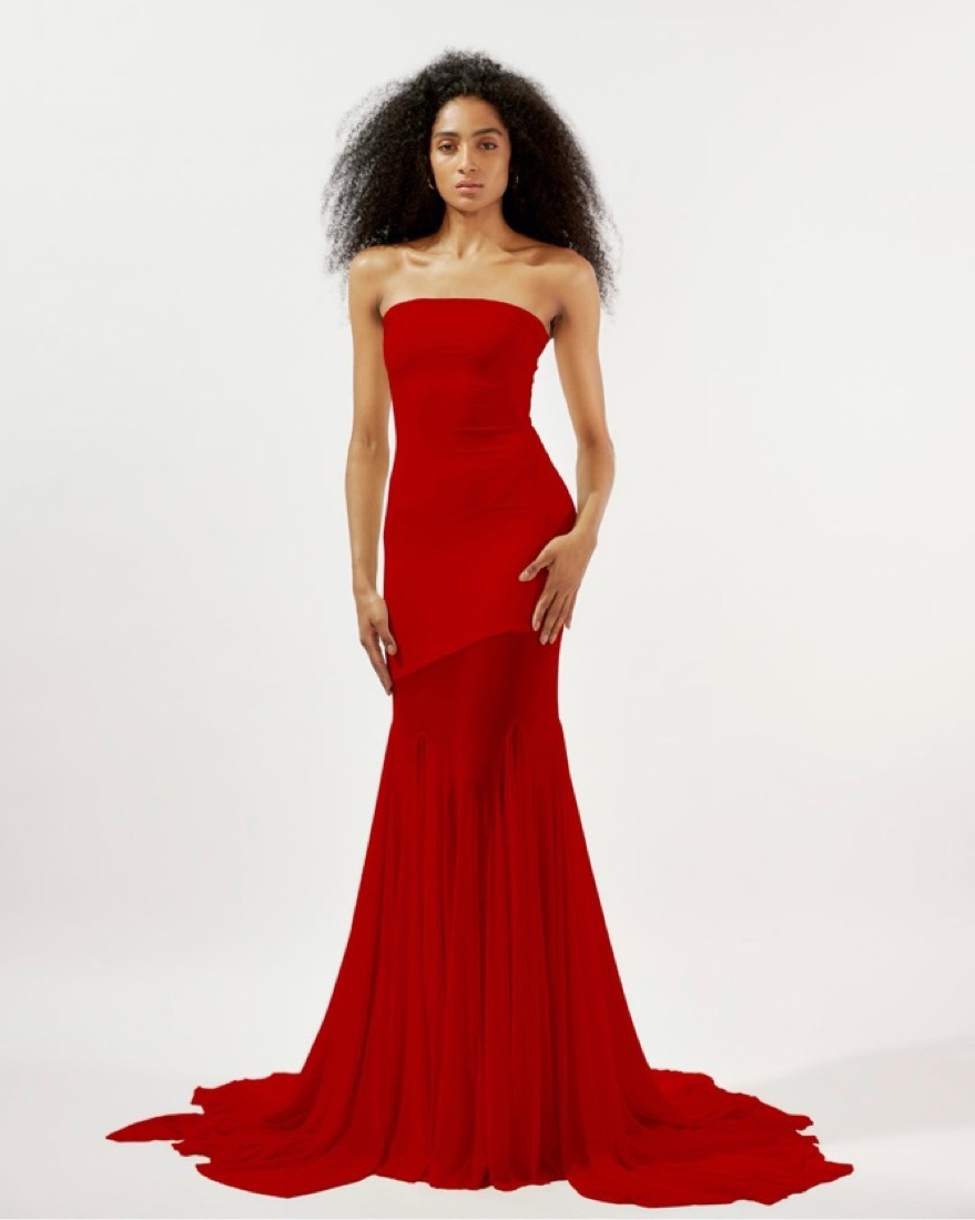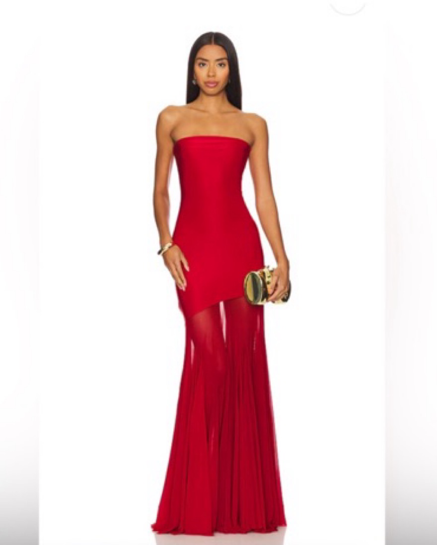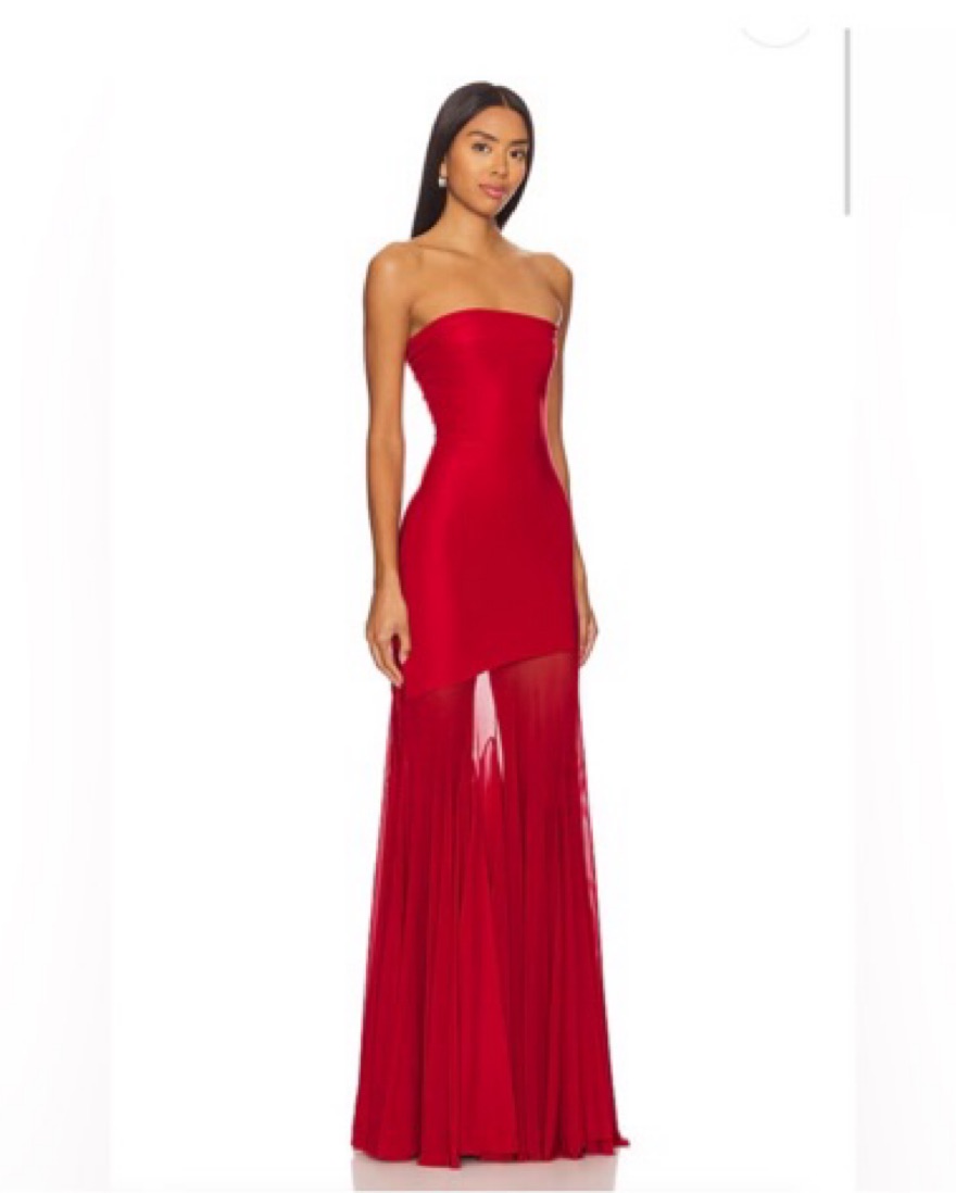 Slinky jersey red Bodycon dress with flowy mesh mermaid skirt at the bottom. Pull on styling.