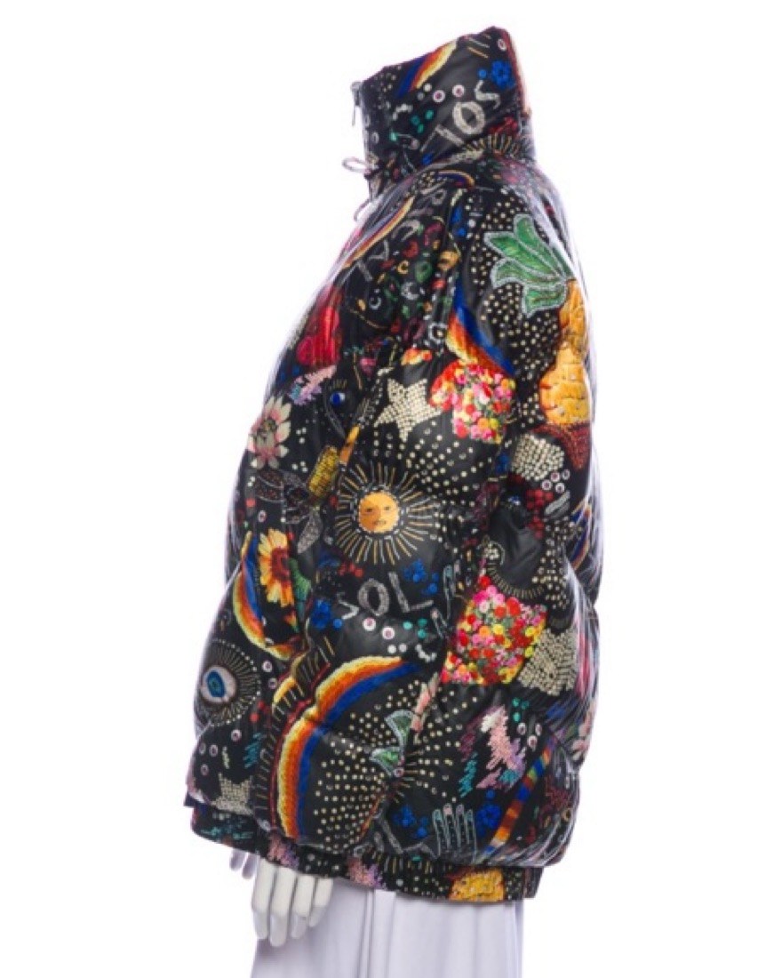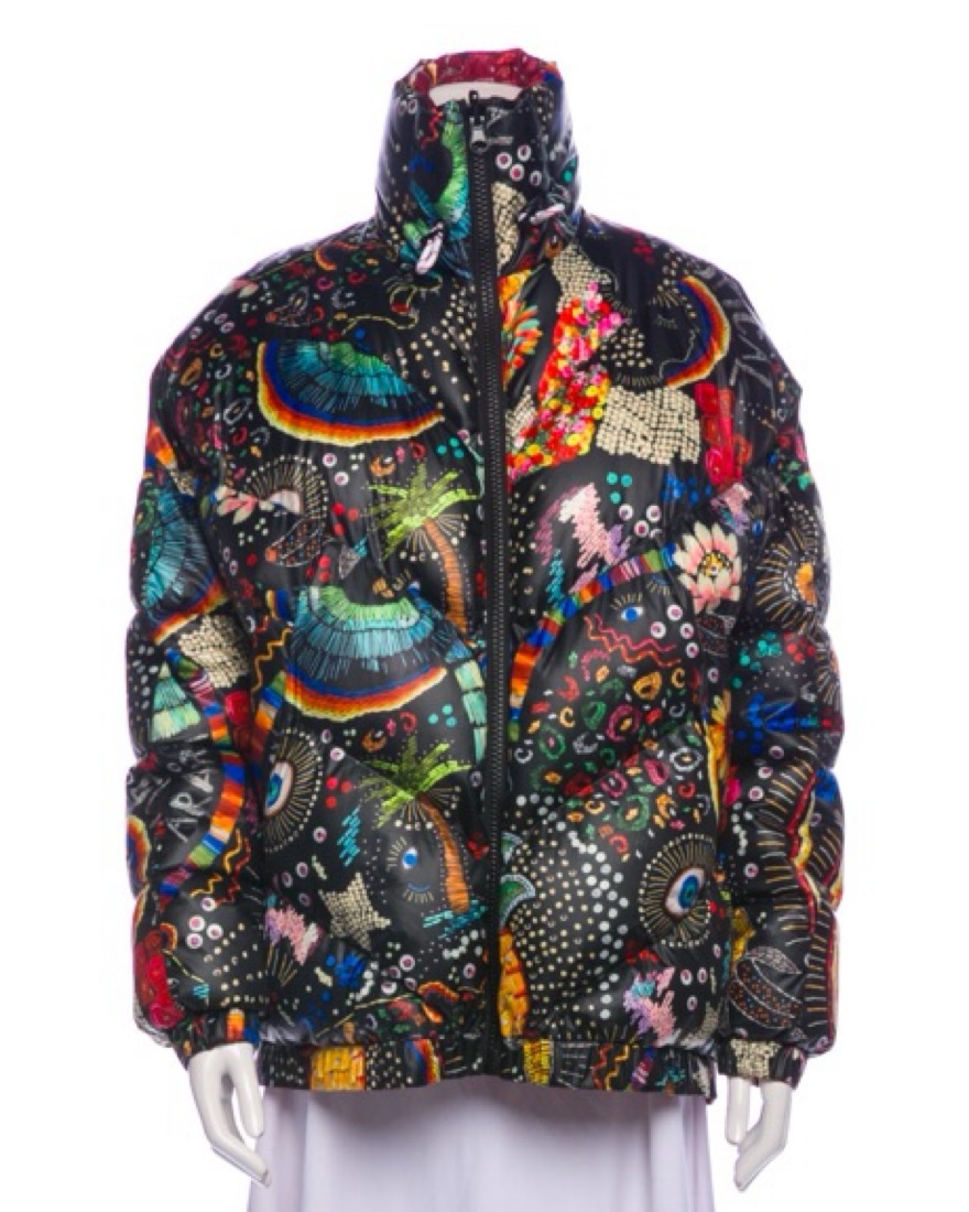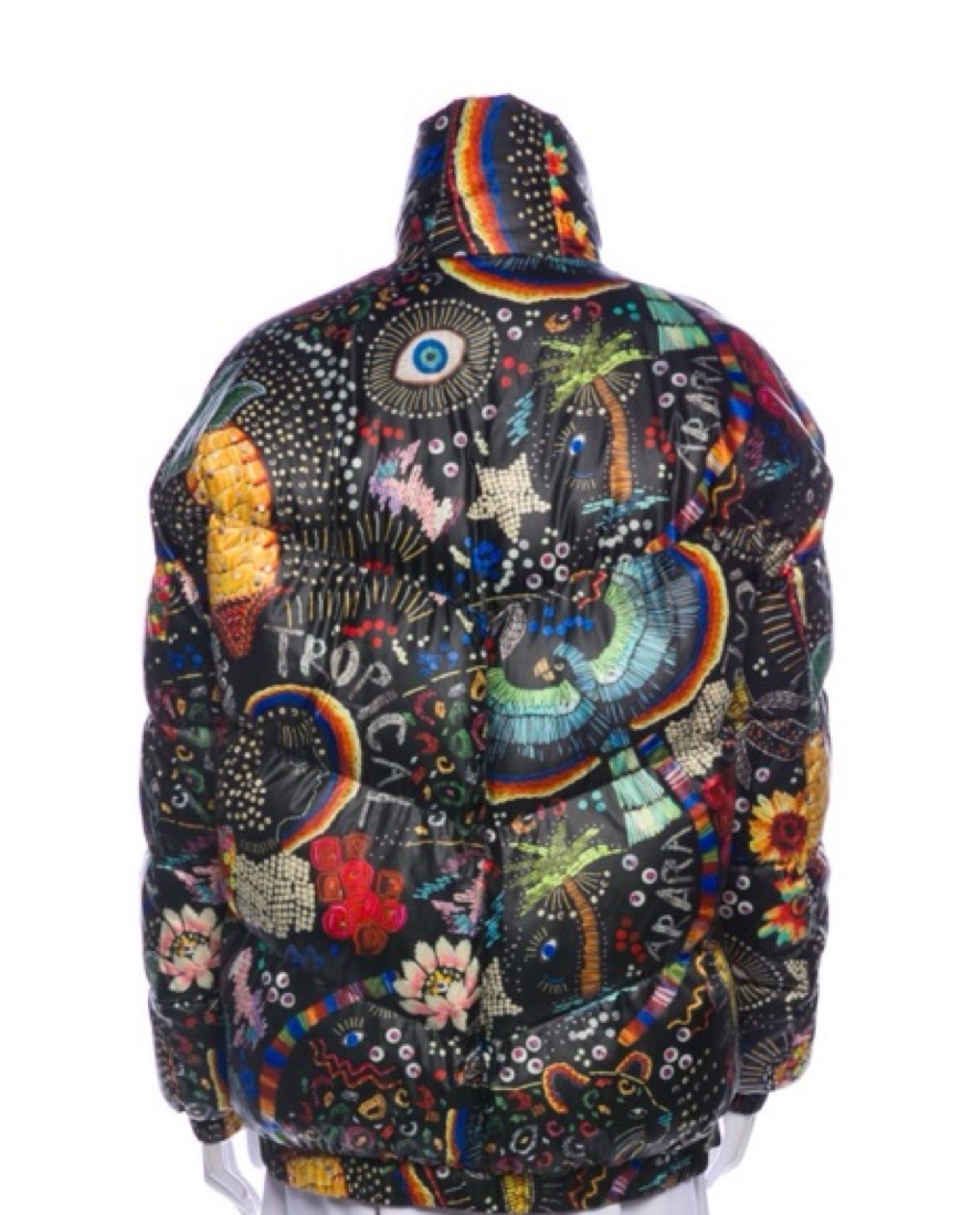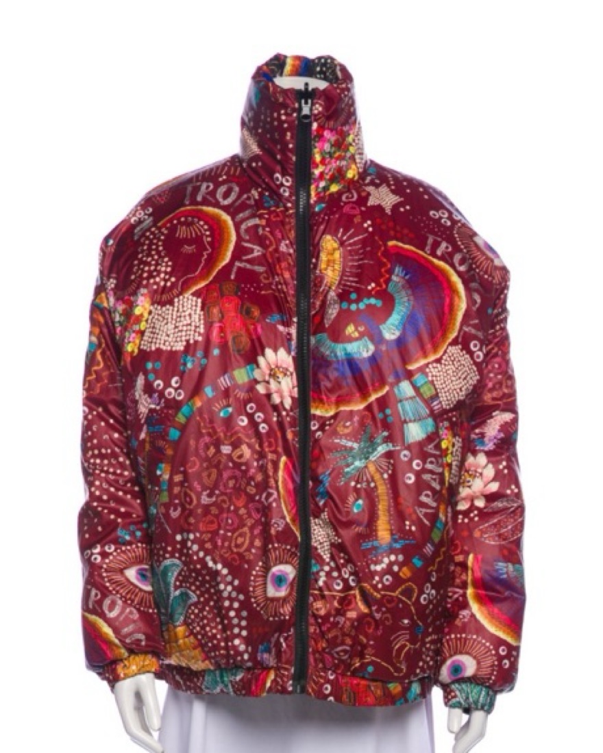 Fun and funky printed ski, snowboard or cold weather puffer jacket. One side has an eclectic black and multicolor pattern print and the other is red and patterned! Has elastic closure on neck and waistband. I get so many compliments on this!