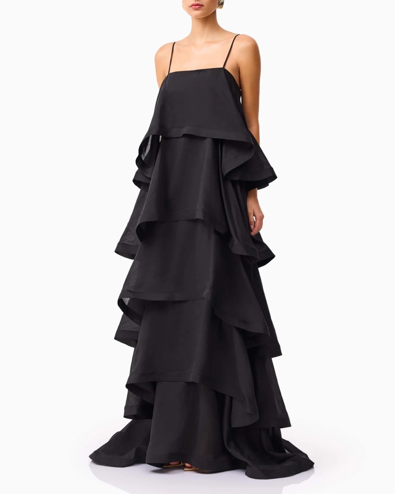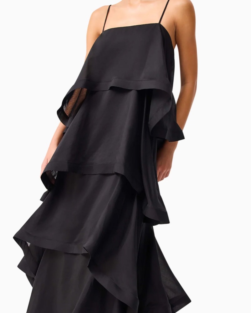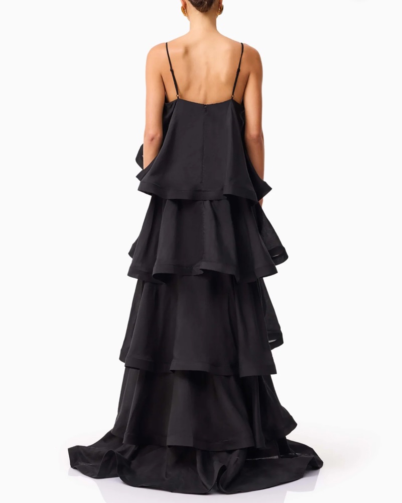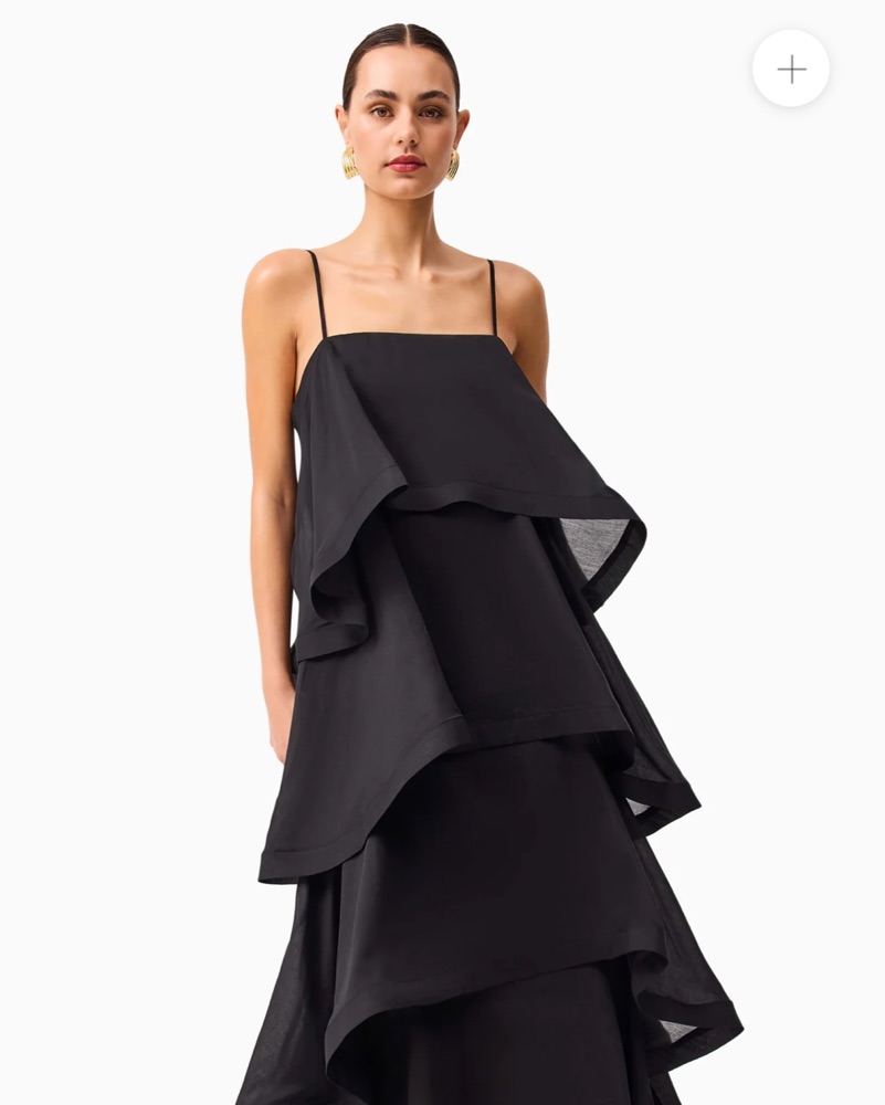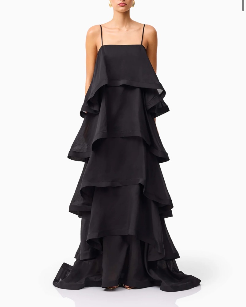 This exquisite black gown features a dramatic tiered skirt and adjustable spaghetti straps, creating a stunning silhouette perfect for formal events. New with tags 🖤
