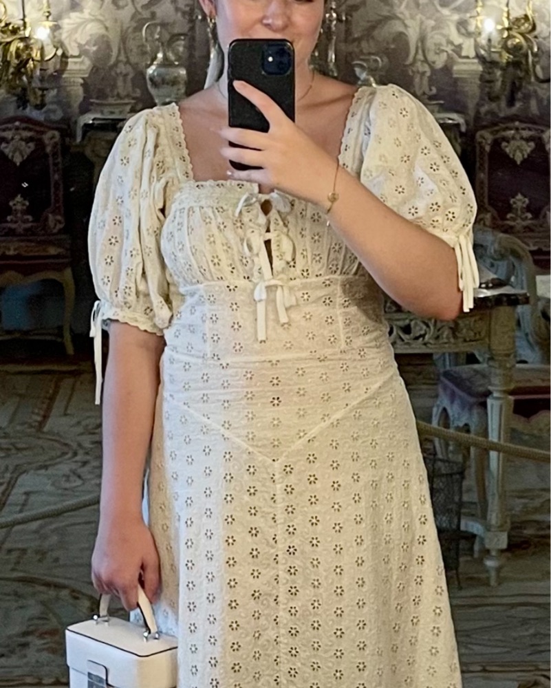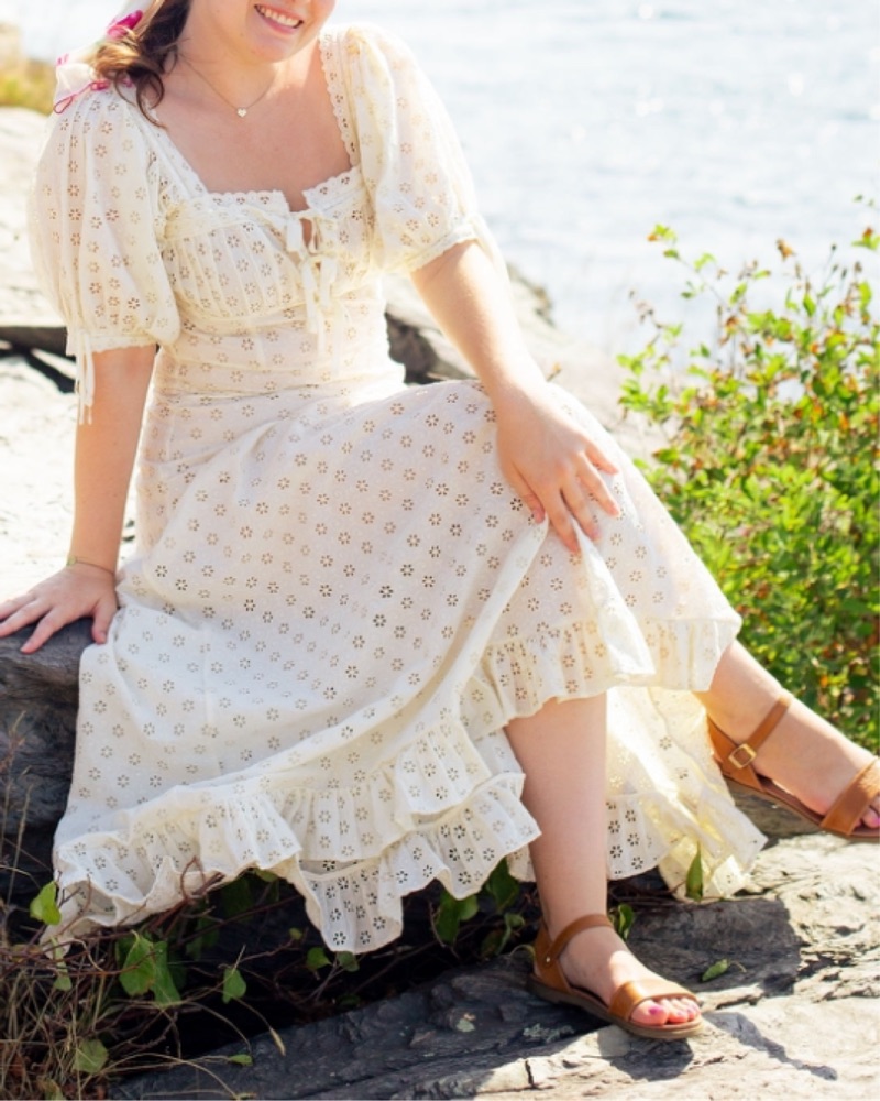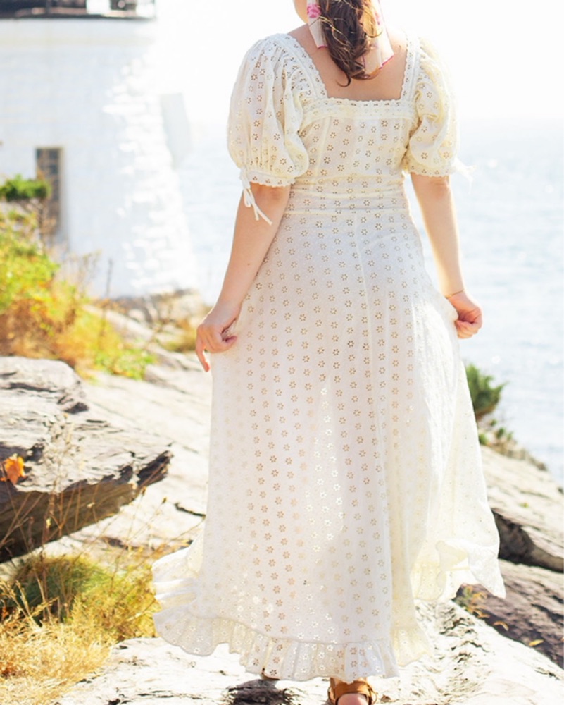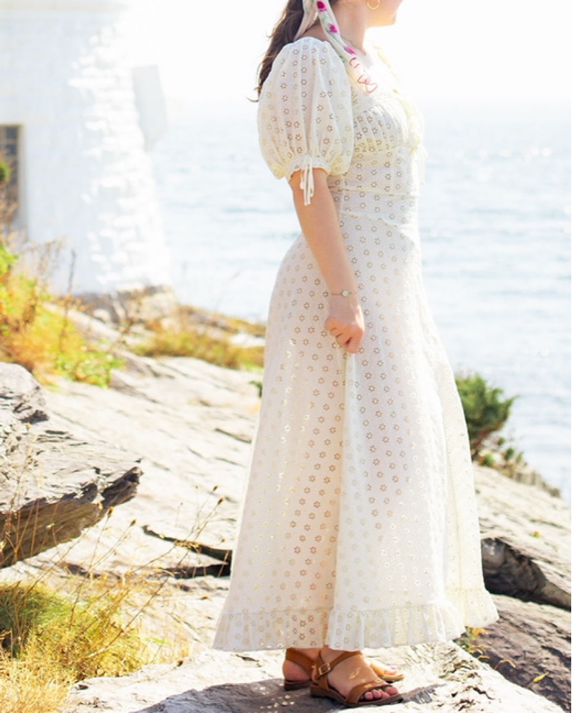 This gorgeous puff sleeve eyelet maxi dress is perfect for any summer occasion. It’s adorned with grosgrain ribbon bows, and has a very flattering drop waist