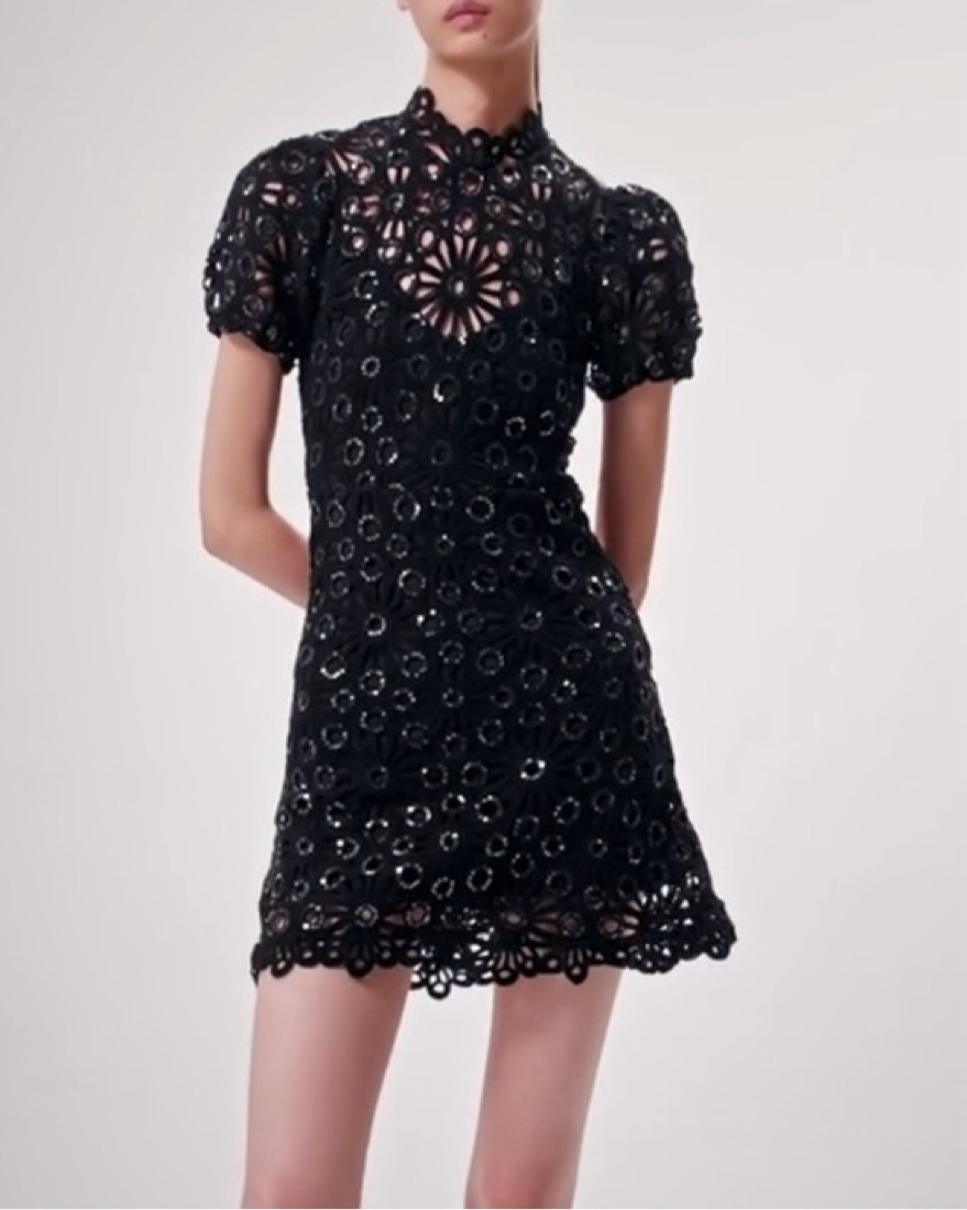 IN PERFECT CONDITION - never worn. Flowers embellished with sequins adorn this short dress in openwork crochet and guipure, creating an interplay of textures. Alongside elasticated short sleeves, it features a subtle interplay of sheer details, and has a lining with a plunging V neckline.