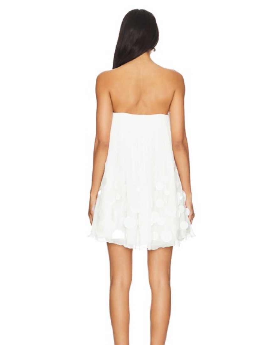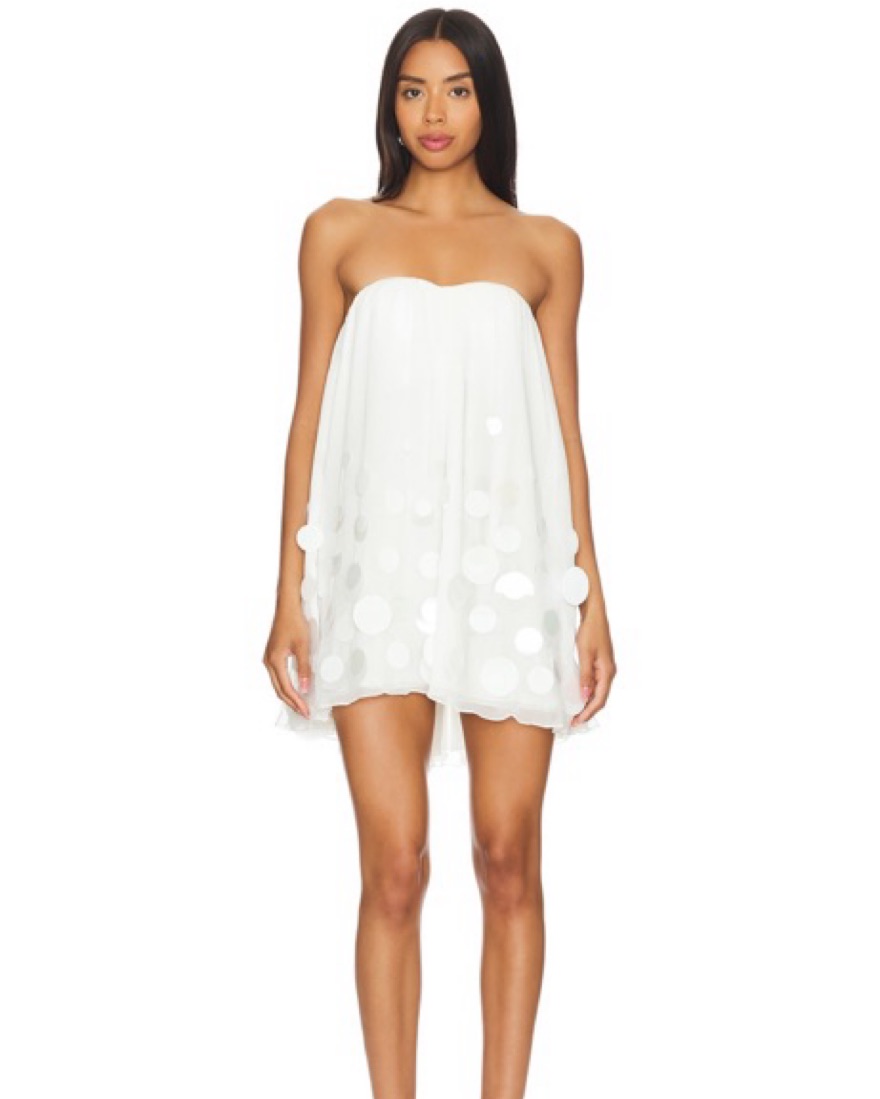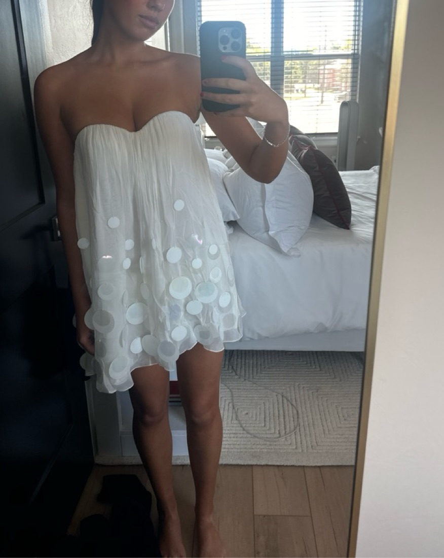 Prettiest dress! It’s super delicate and so are the stitched paillette sequins. Size xs and has padded cups inside and sweetheart neck. Runs pretty short and I’m 5’5 for reference. Do not wash it!!!! This is dry clean only