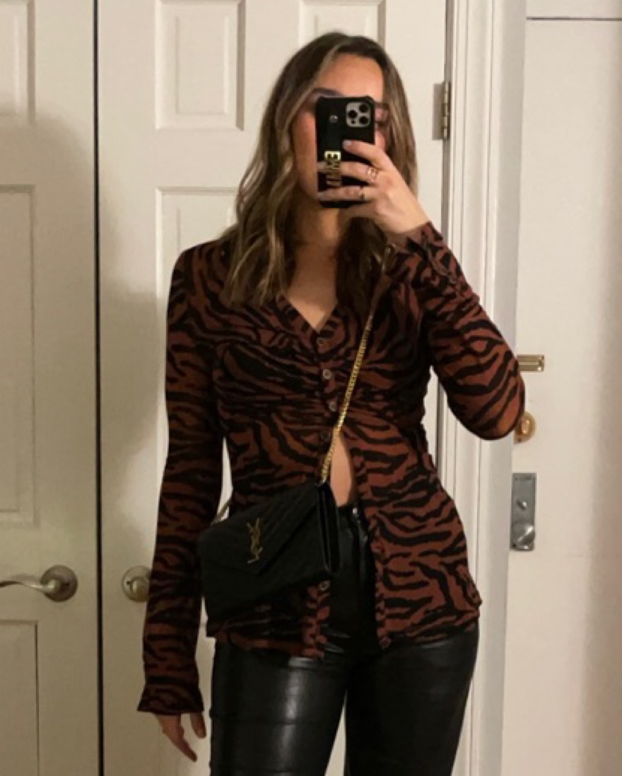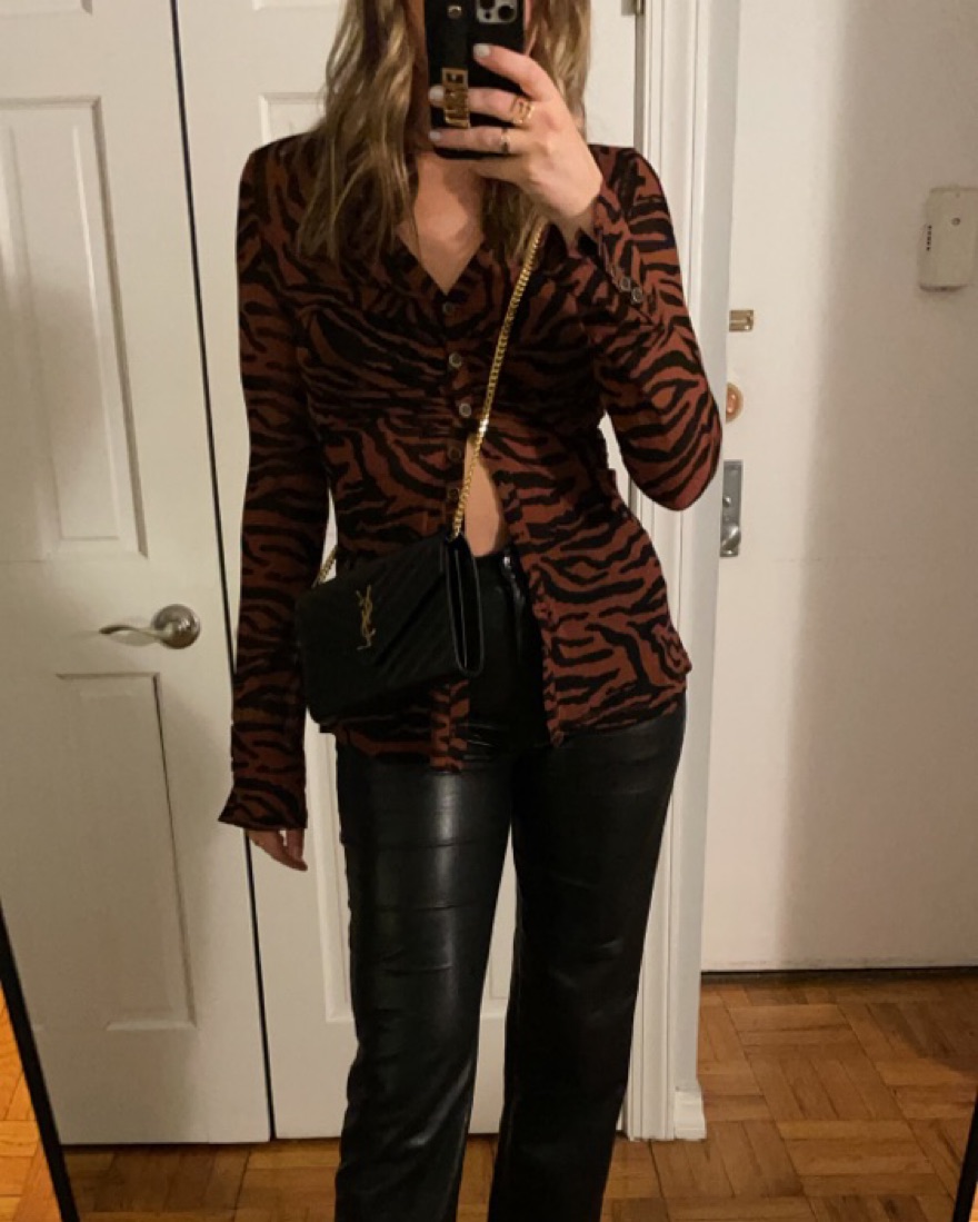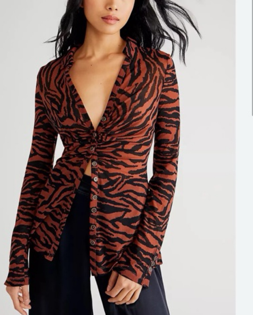 mesh top with buttons ans ruching. Really cute atyles with a black bralette underneath and worn mostly unbuttoned