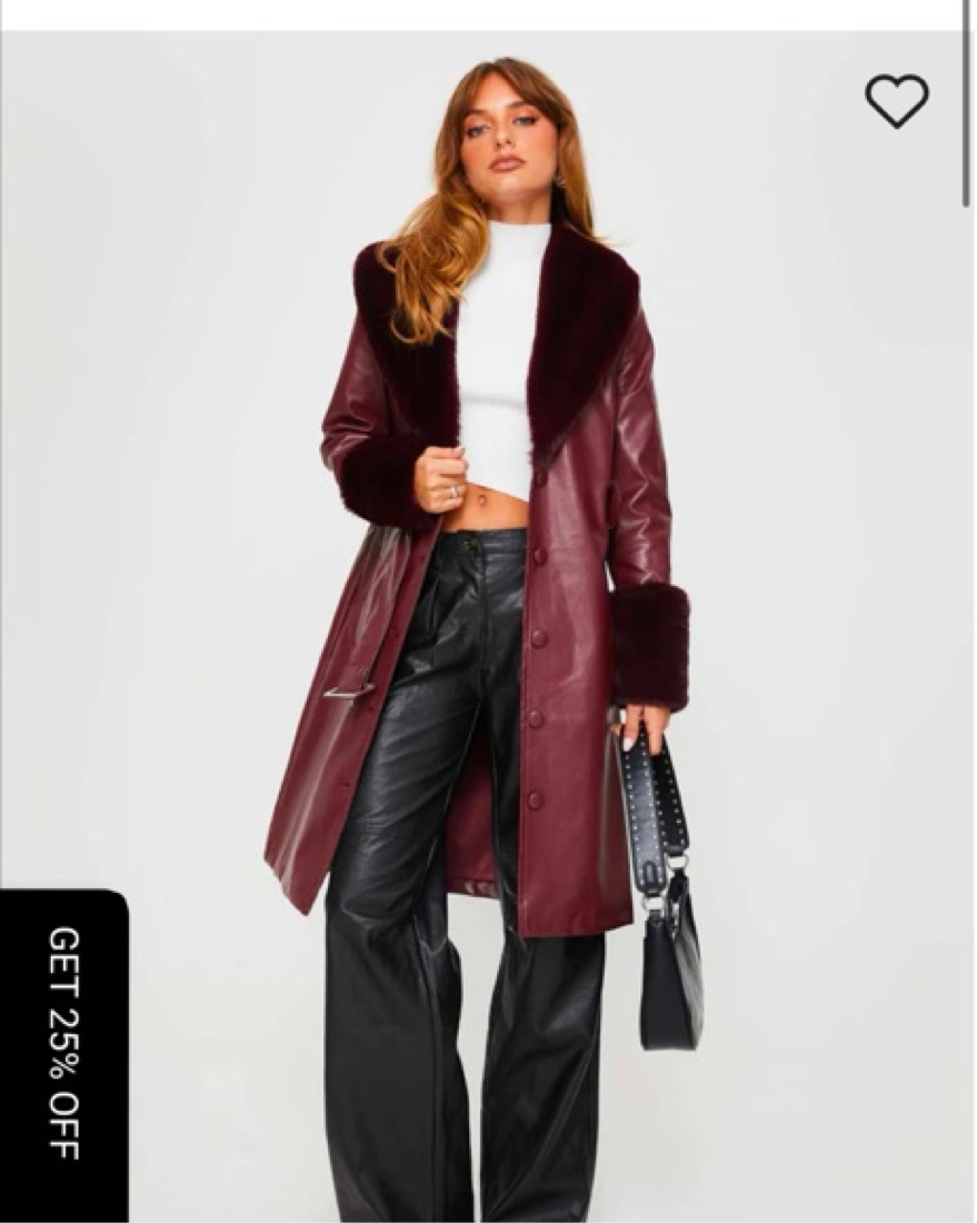 Lioness Faux Leather Lined Belted Coat. **Used burgundy photos as a reference coat is beige but the same coat**