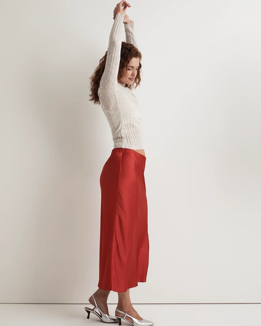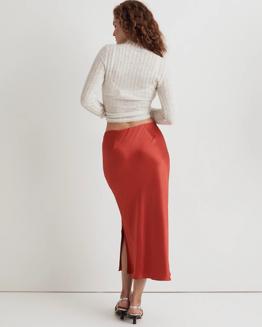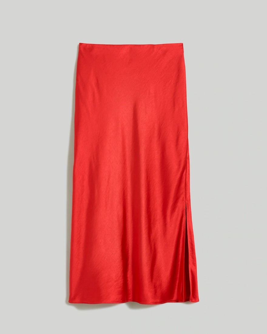 Madewell, The Layton Midi Slip Skirt in Satin. Color: Wild Poppy. Super comfy pull-on elastic waist and side slit. 29 3/4” long.