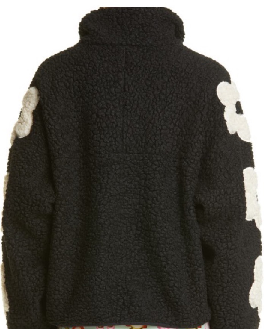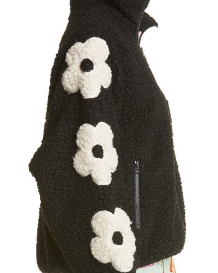 As a throwback to supersweet ‘90s styles, cartoonish blooms sprout along the sleeves of this high-pile faux-fur jacket with a slightly cropped, boxy fit. A light-pink mesh lining enhances breathability while adding a playful pop of contrast.