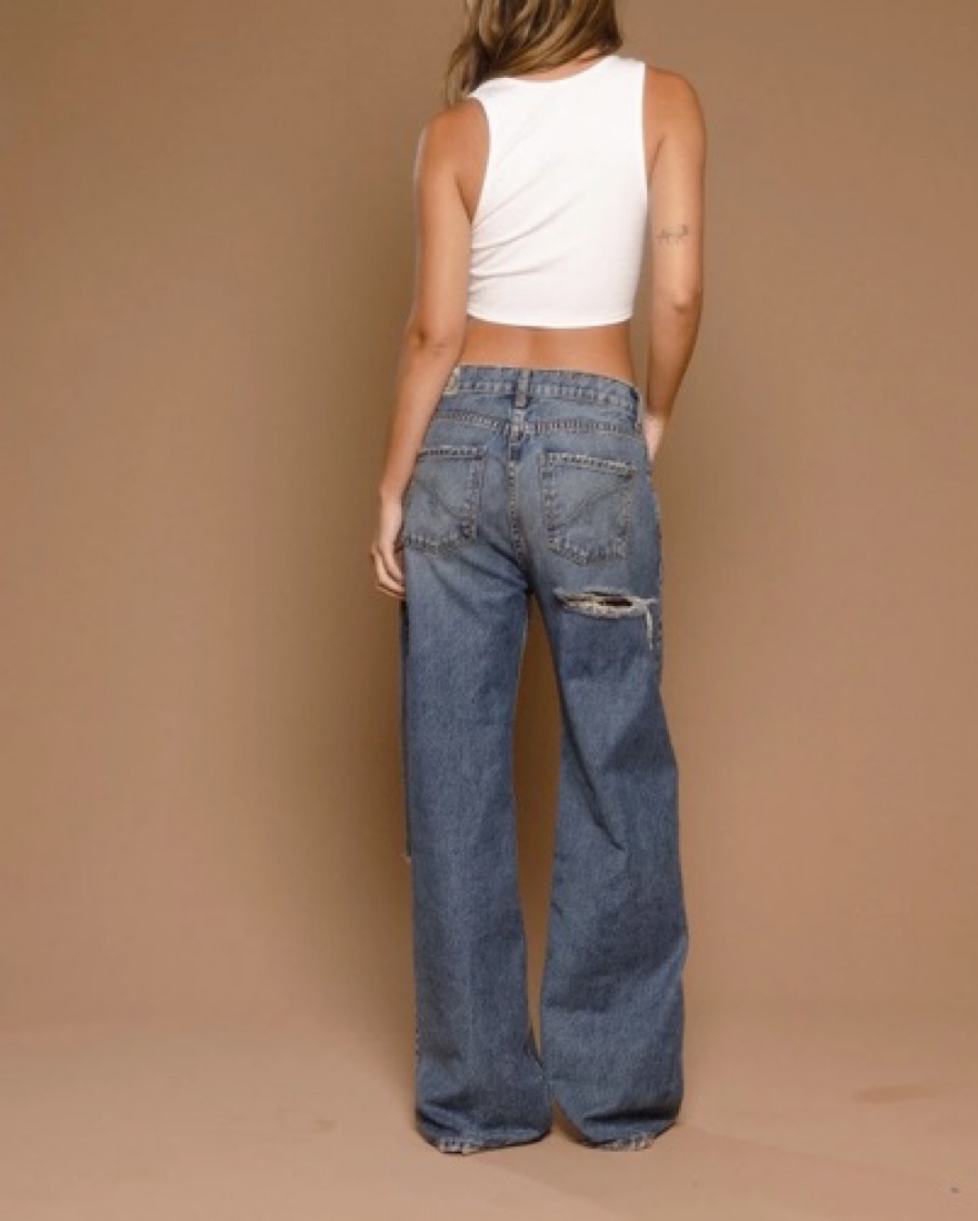 These oversized jeans features a cross waistband and baggy pant lets now available in a vintage-inspired wash. This wash features a back pocket rip. *RUNS LONG IN LENGTH *