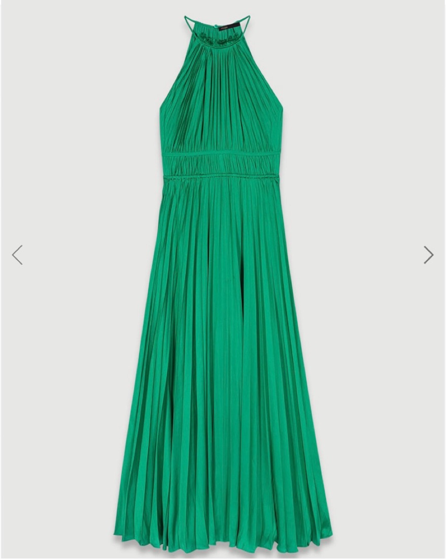 From the Maje site “This satin-effect maxi dress in this season's signature colour is sure to dazzle. Alongside a round neck with American-style armholes, it has plenty of irresistible details such as a slit at the back and ties that fasten at the sides. It has a delicately accentuated waist.”