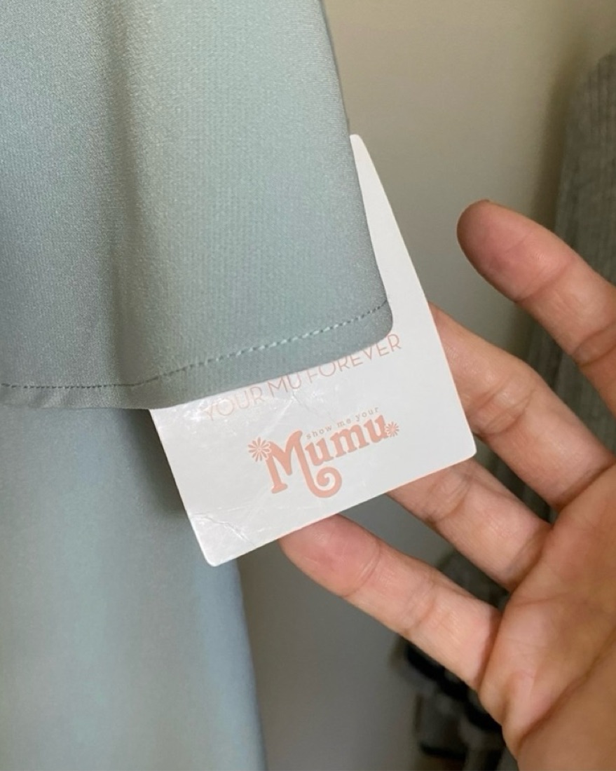 NWT Show Me Your Mumu Monaco Ruffle Gown in size S, color “silver sage”! It’s more of a sage/blue green color than silvery blue. I have not worn it yet but it has a small pen mark (pictured). Located in Clinton Hill