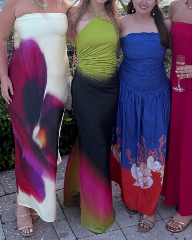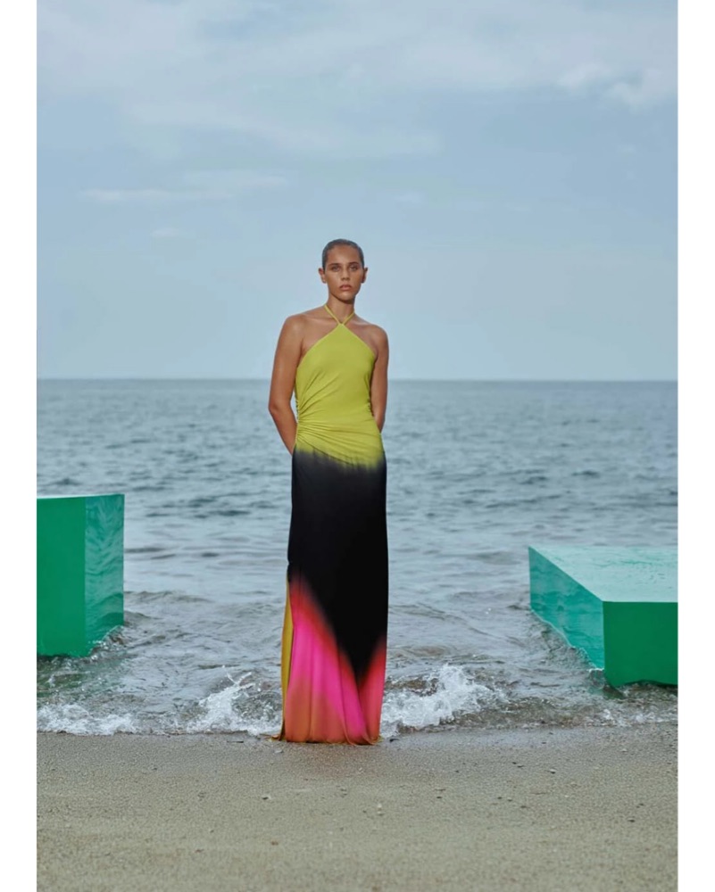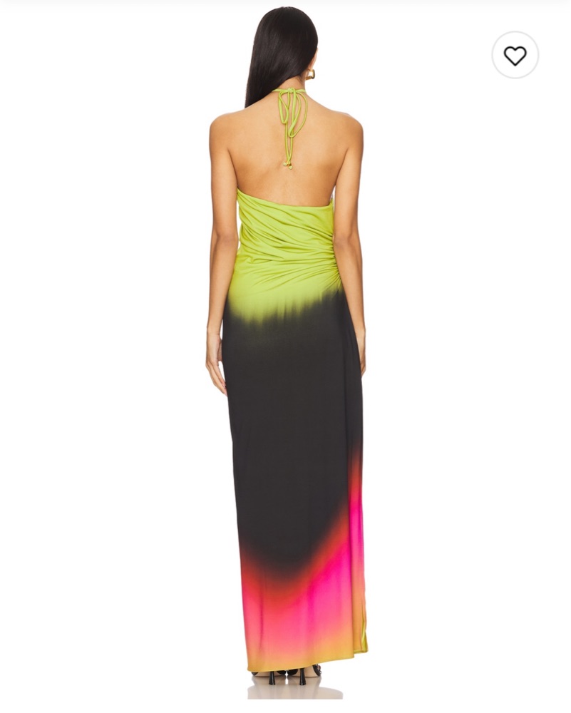 Ombré halter maxi dress with ruche detailing, open back, and a side slit. Perfect for a formal event or special occasion!