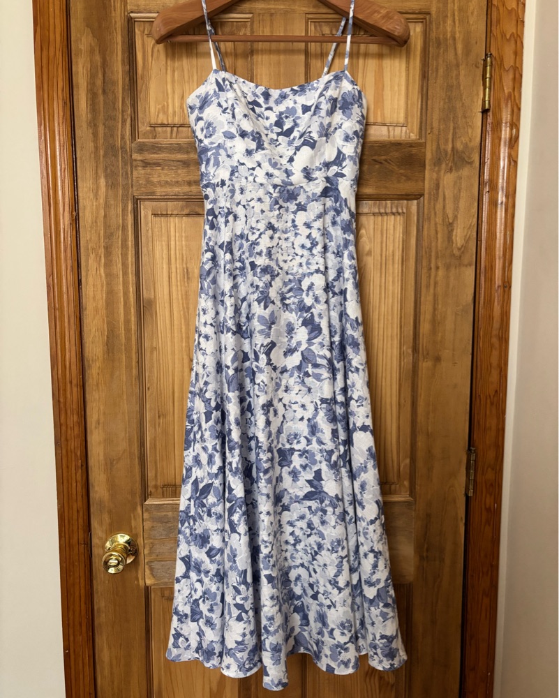 Beautiful dress, nice linen material. Not altered. Adjustable straps. Larkspur blue/white floral pattern