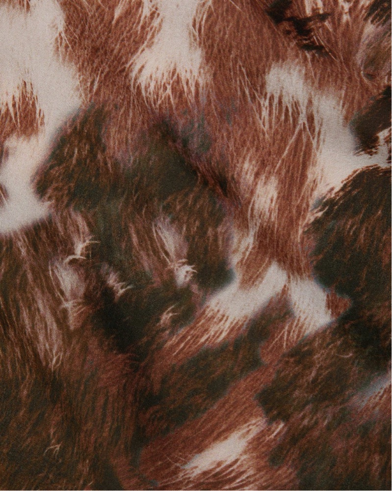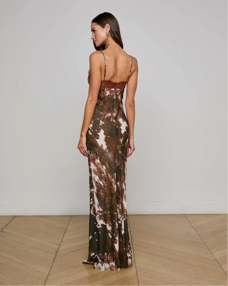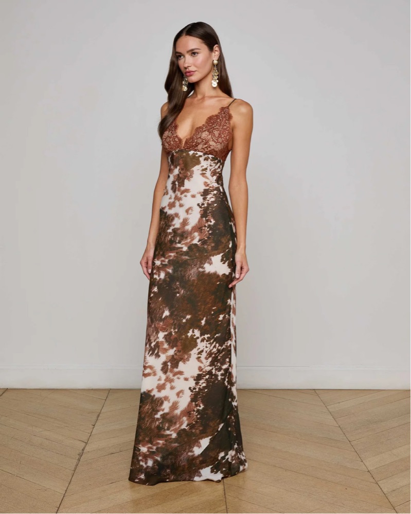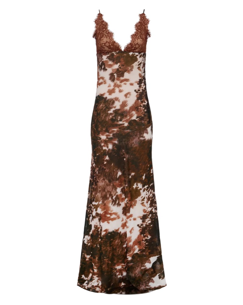 Intimate glamour defines the Susanna. Sultry lace offers the illusion of lingerie while fluid silk drapes beautifully against the figure. Now in a trend-forward cow print.