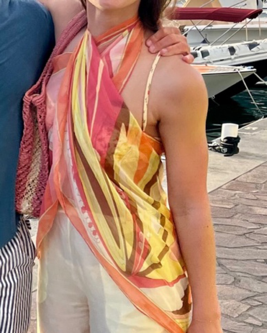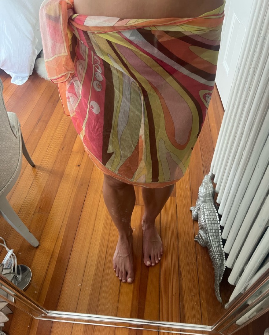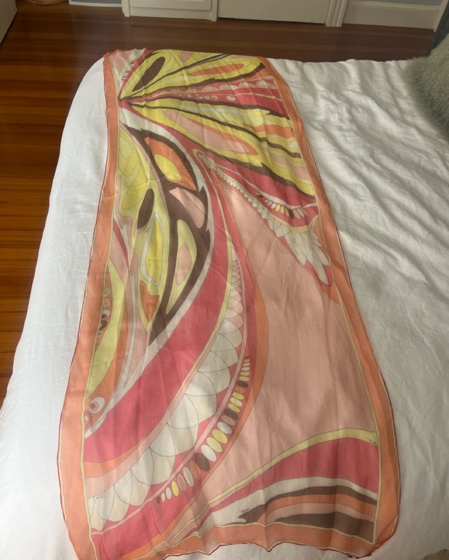 Vintage, pink, yellow and orange silk Pucci scarf. I’ve used it as a sarong and a top. 2 feet wide and 5 1/2 feet in length.