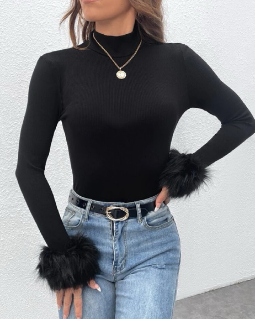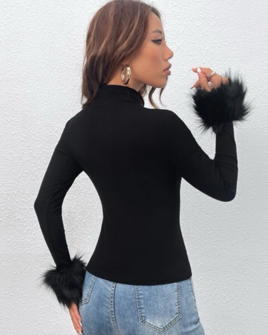 Elevate your look with this sophisticated black top. The feathered cuffs add a touch of glamour, perfect for a night out or special event.