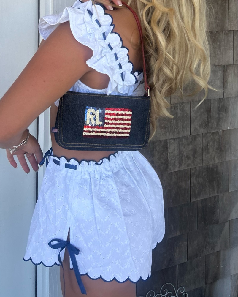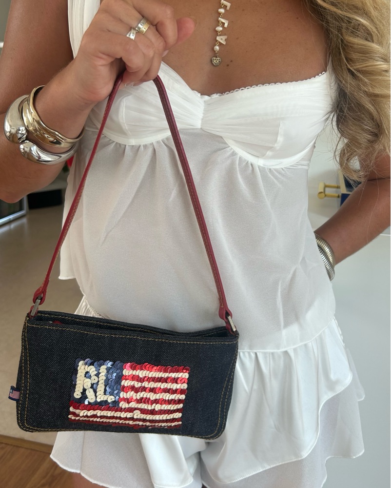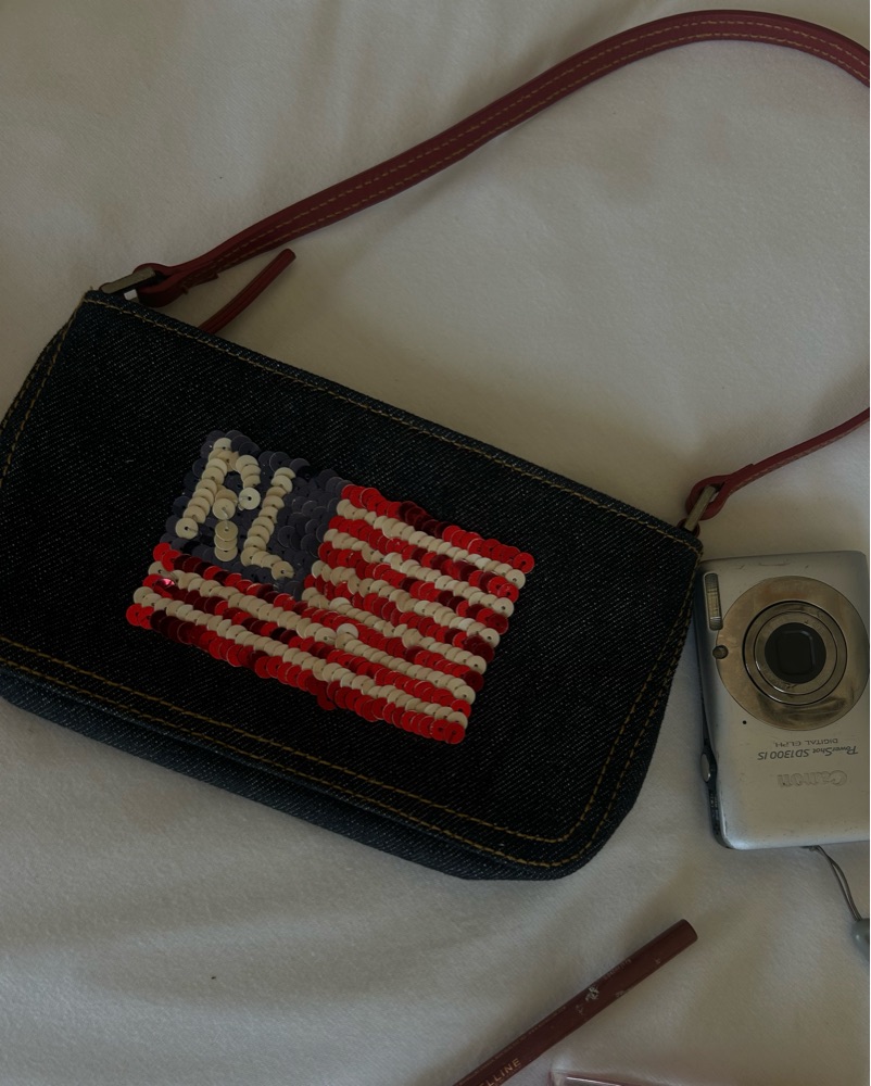 Vintage Ralph Lauren shoulder bag features an eye-catching sequined American flag design on a dark wash denim bag with a red strap.