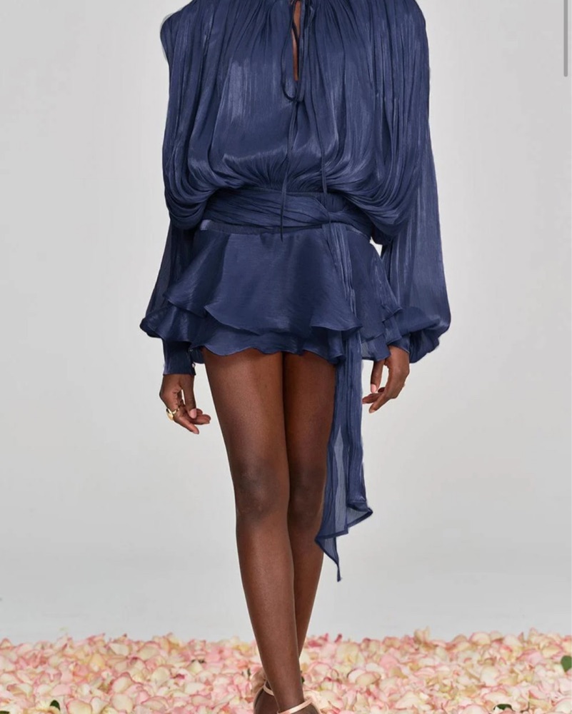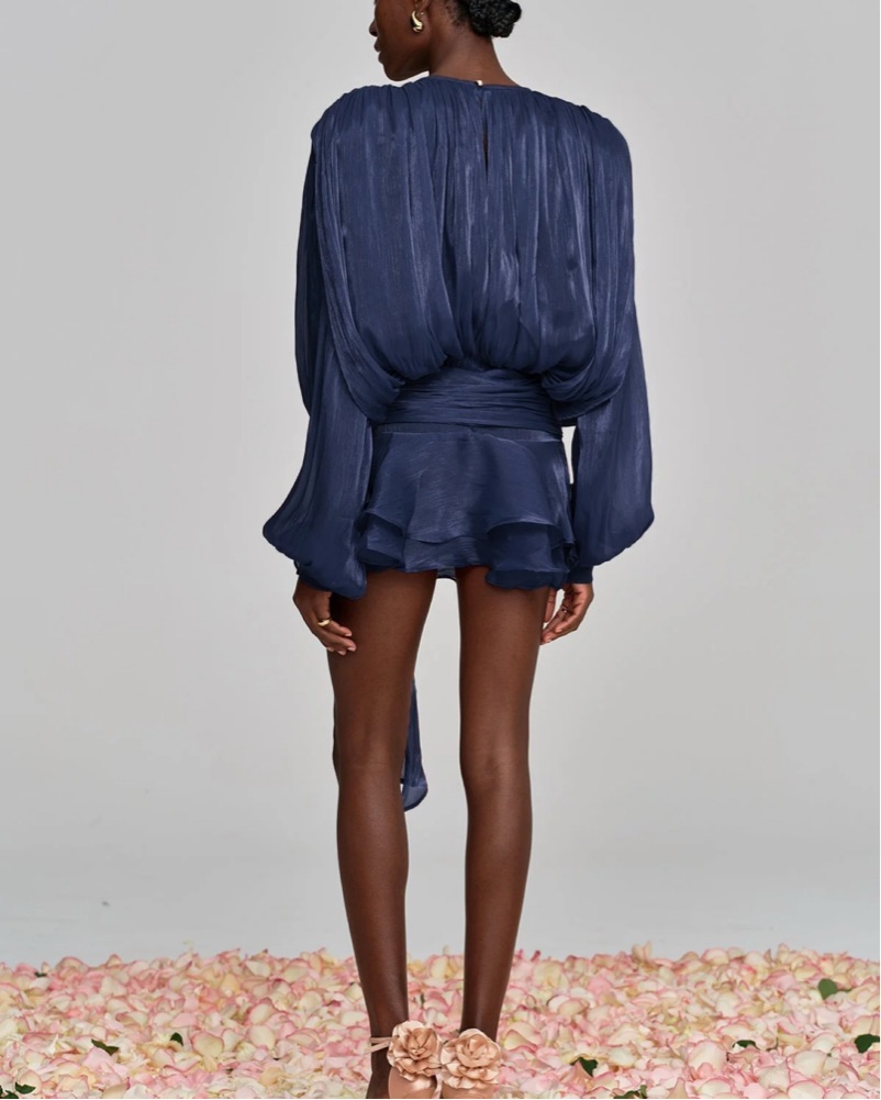 Expertly crafted with a deep blue hue, the Aminah Balloon Sleeve Dress exudes elegThis stunning satin mini dress is perfect for a night out or a special event. The billowing, ruffled sleeves and high-low hemline create a chic, elegant look.