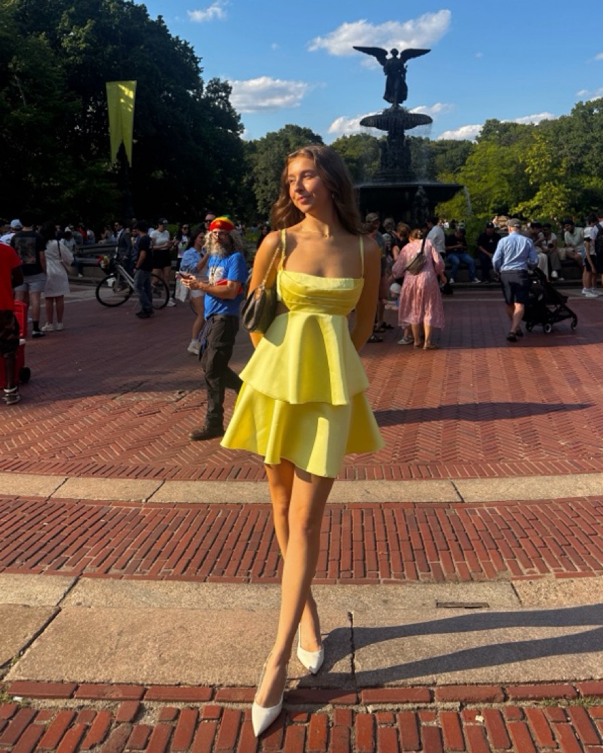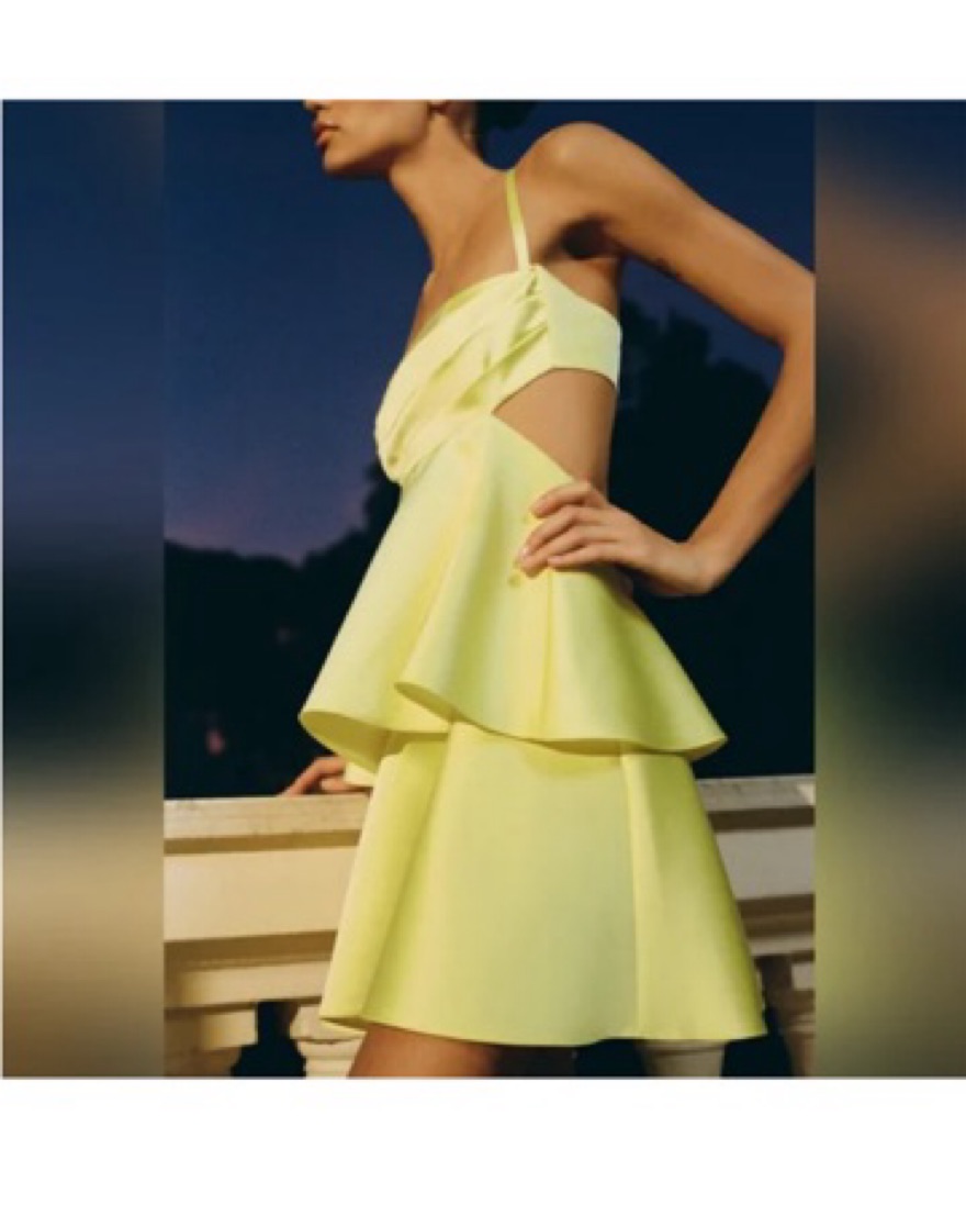 Renting this yellow mini dress with suttle ruffles for the perfect cocktail dress🌟 Great for a date, dinner or cute weekend plans in the city! Dress has pleated straight neckline & thin straps. Open back detail, back hidden in-seam zip closure & tonal lined buttons!