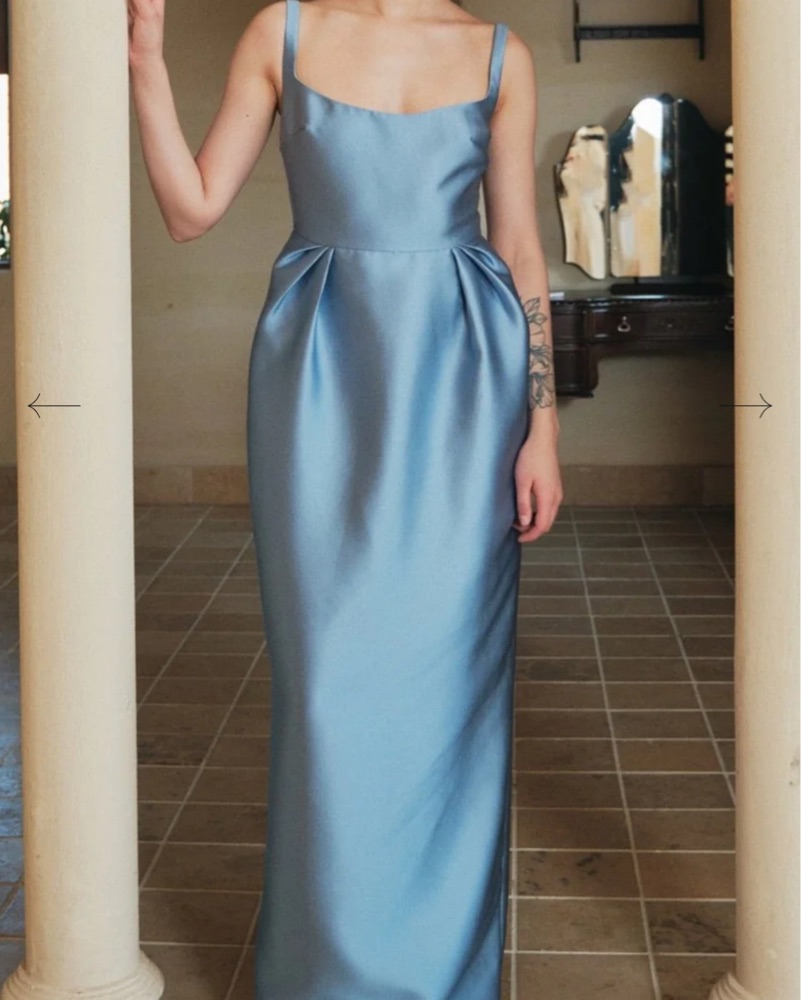 This stunning floor-length maxi dress features a sleek, elegant silhouette with delicate pleating details that create a truly sophisticated look.