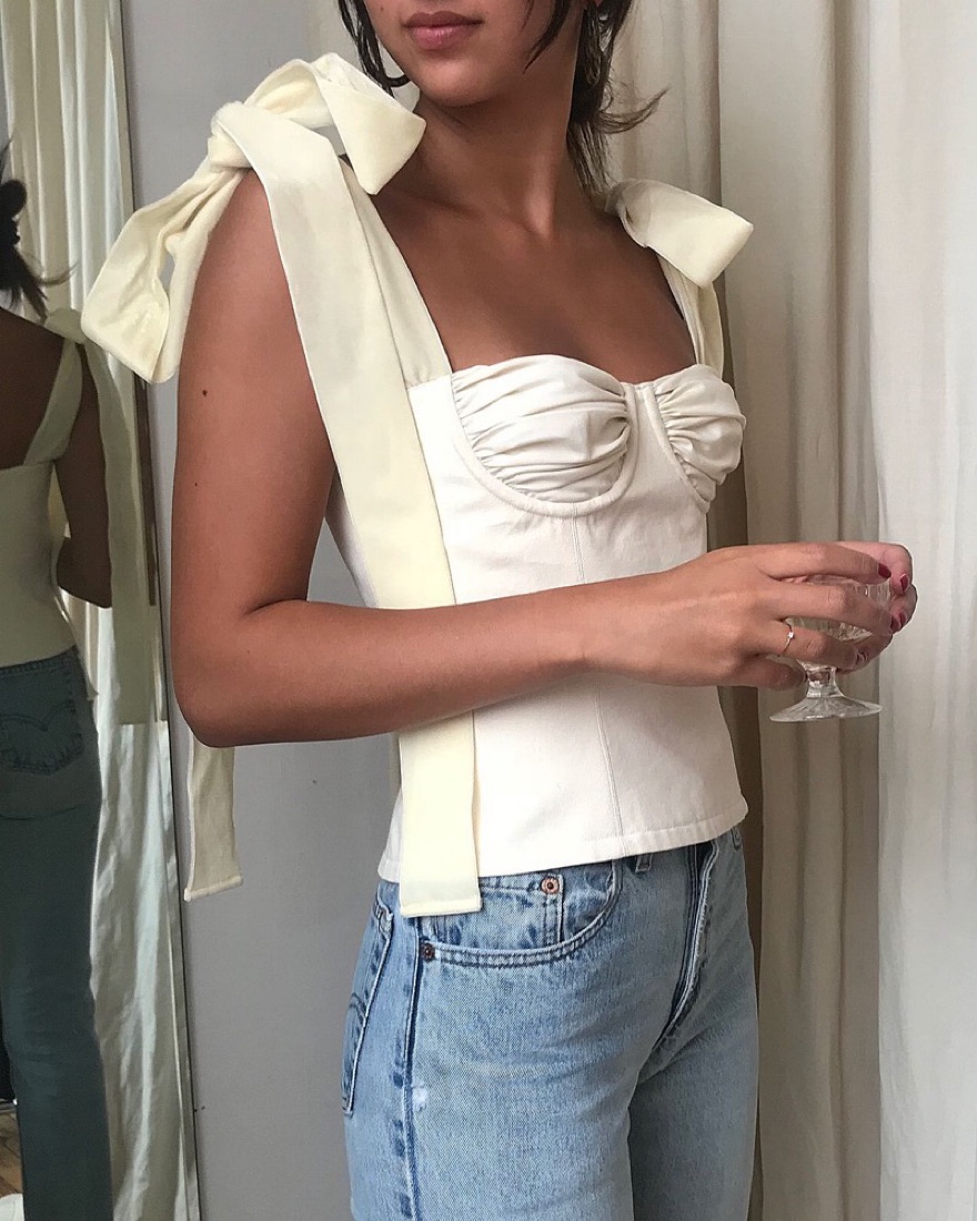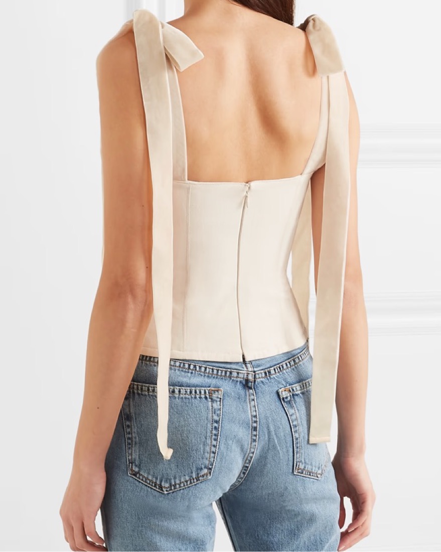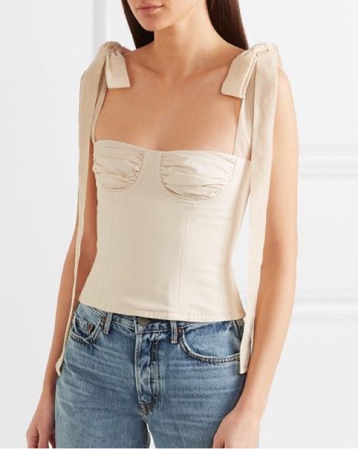Orseund Iris says this bustier top is made from cotton-canvas with a corset-style boned bodice and has dramatic velvet ribbons that can be tied into bows at the shoulders or left nonchalantly undone. Some stains at ends of ribbons but nothing super noticable.
