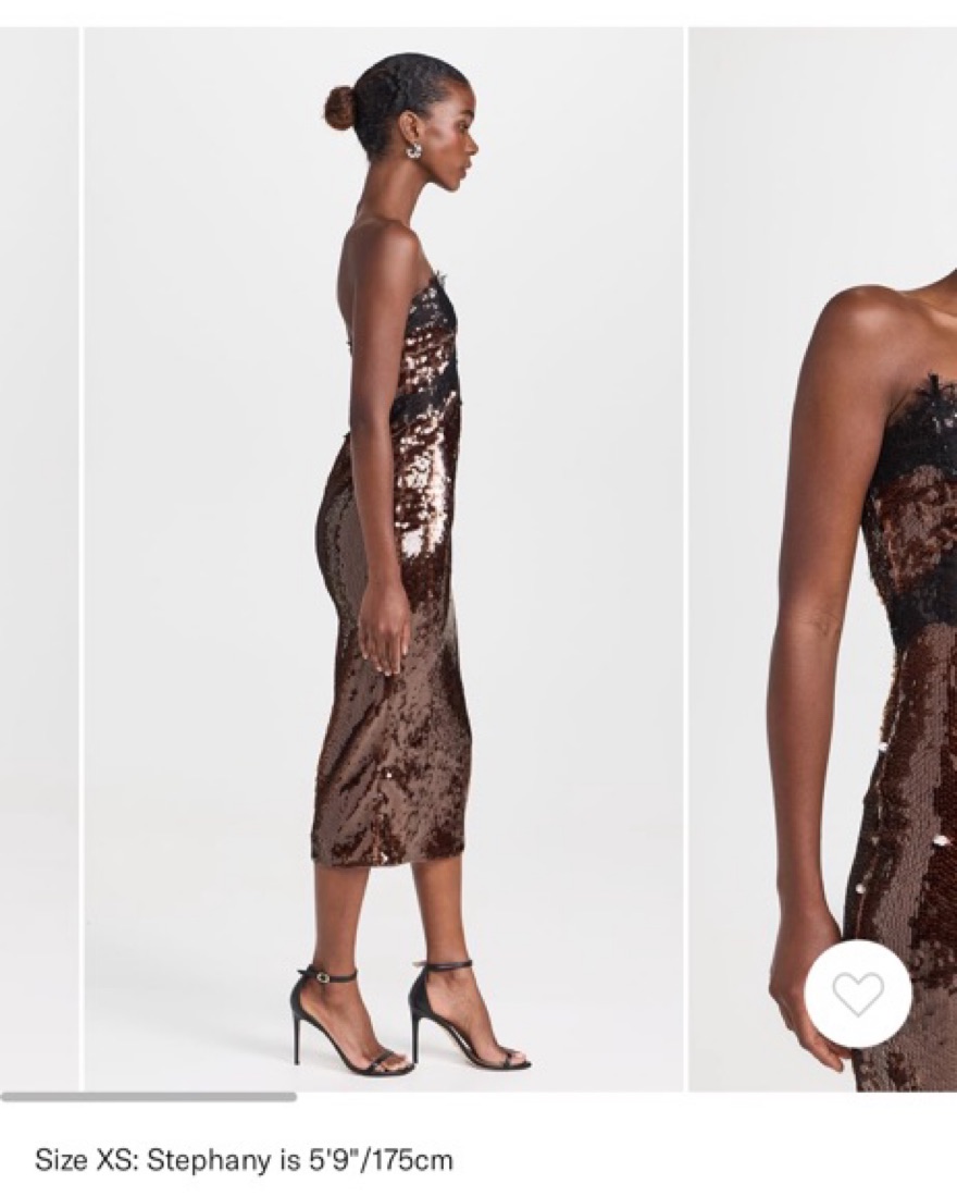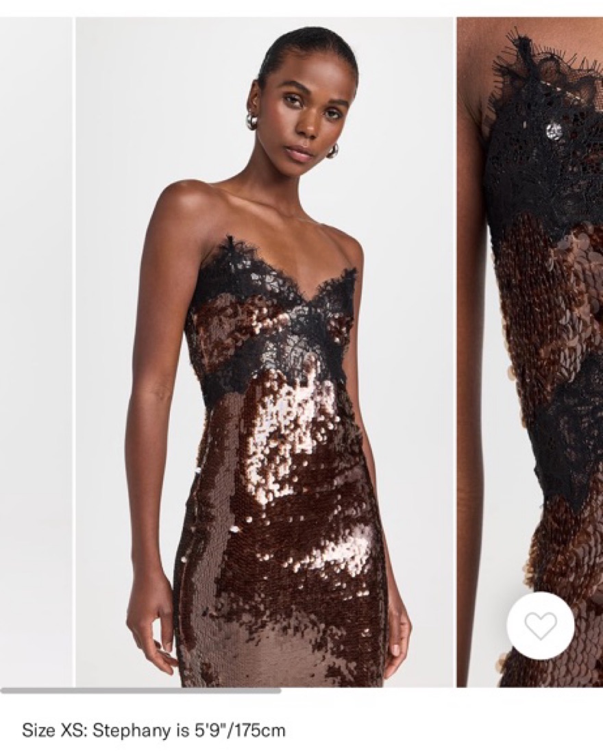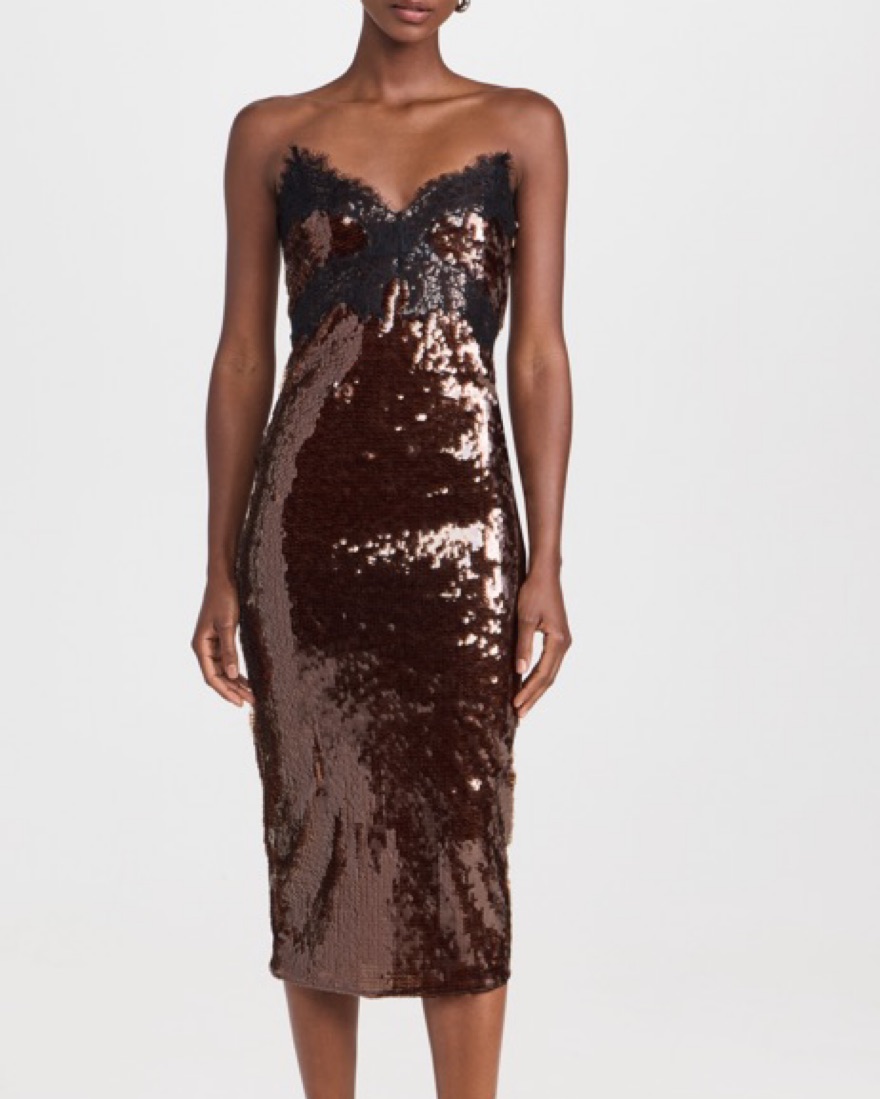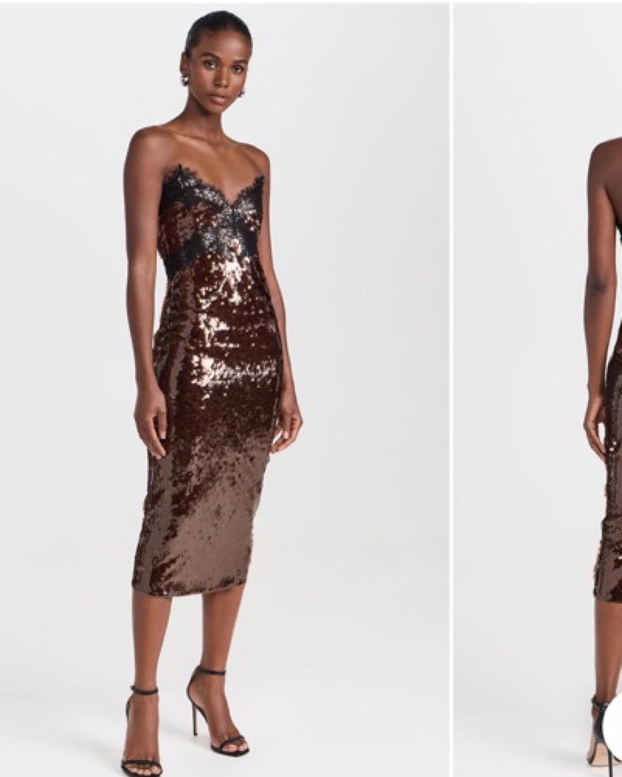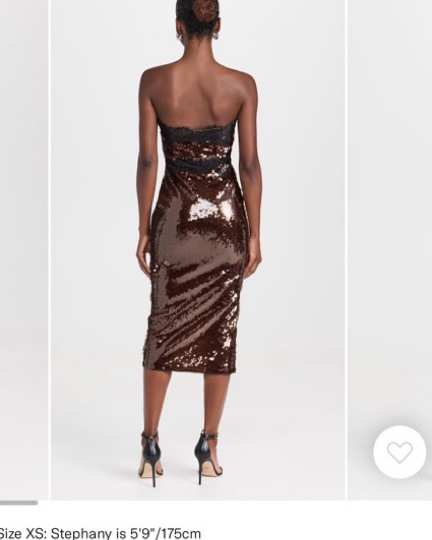 Brown sequins with black lace. Midi fit but hits slightly lower than the photos if you are more petite. I am 5’ 4” and 115lbs for reference. Perfect cocktail wedding guest dress