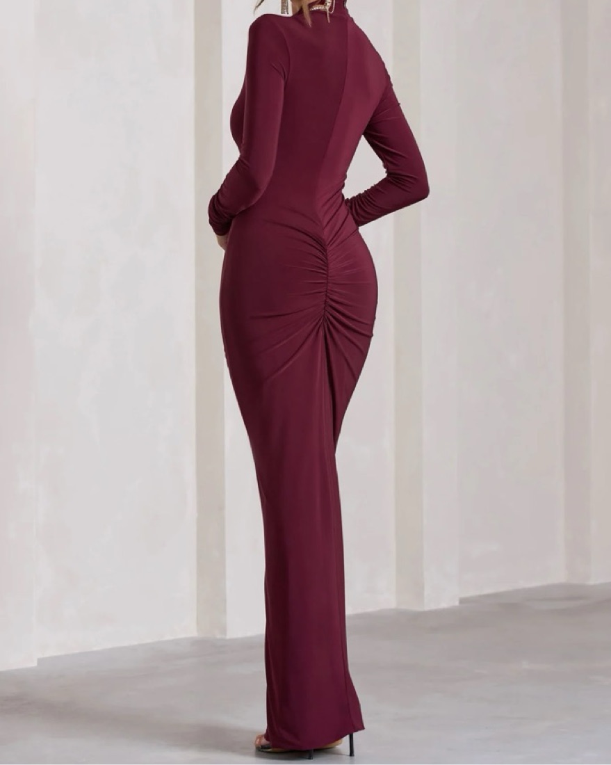 Lynn dress by Club L London. Sexy but covered up! Perfect for a work holiday party or upscale winter event. This sleek and sophisticated maxi dress features a high neckline, long sleeves, and a dramatic side slit for a sultry, eye-catching look.