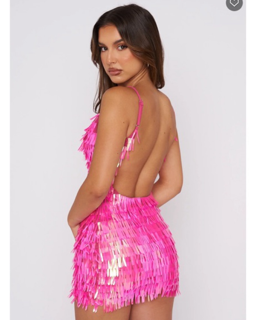 Barely worn White Fox Boutique dress in size small. Featuring thin, adjustable straps, low neckline, invisible side zipper, low back, mesh lining and sequin detail. Polyester/Spandex material.