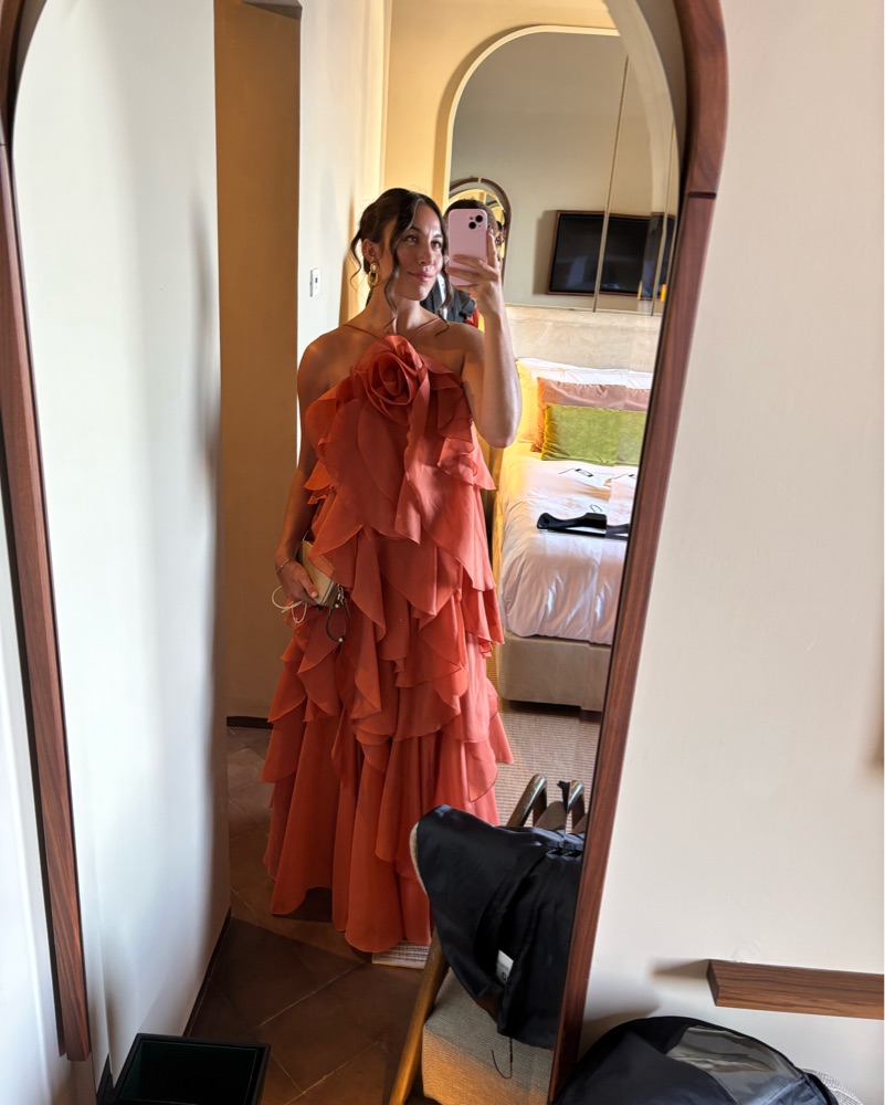 Stunning dress in a rust/terracotta color. Worn once for my brother’s wedding and I have never felt more beautiful! This dress is pure magic and guaranteed to steal the show. Recommended for black tie events. Dry cleaned and ready to rent!