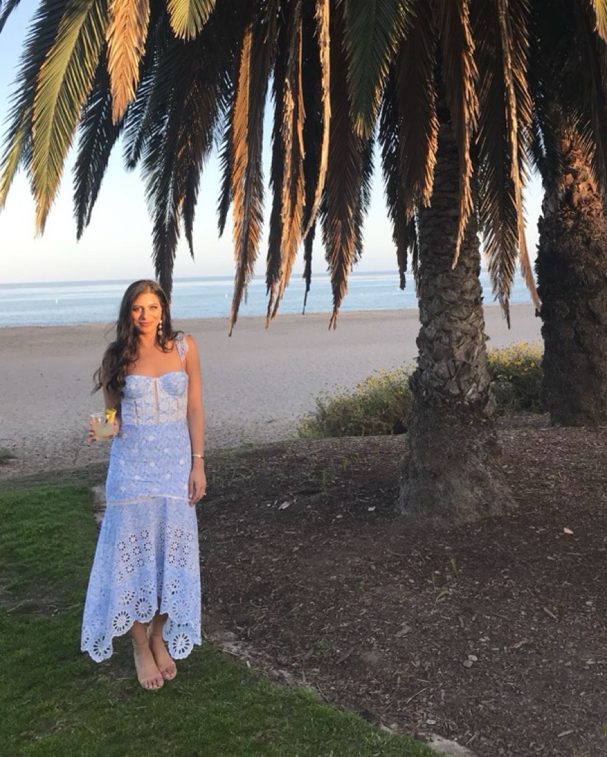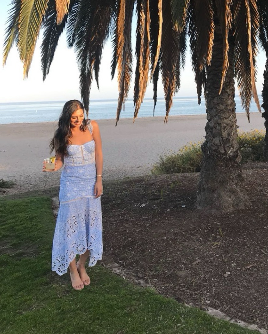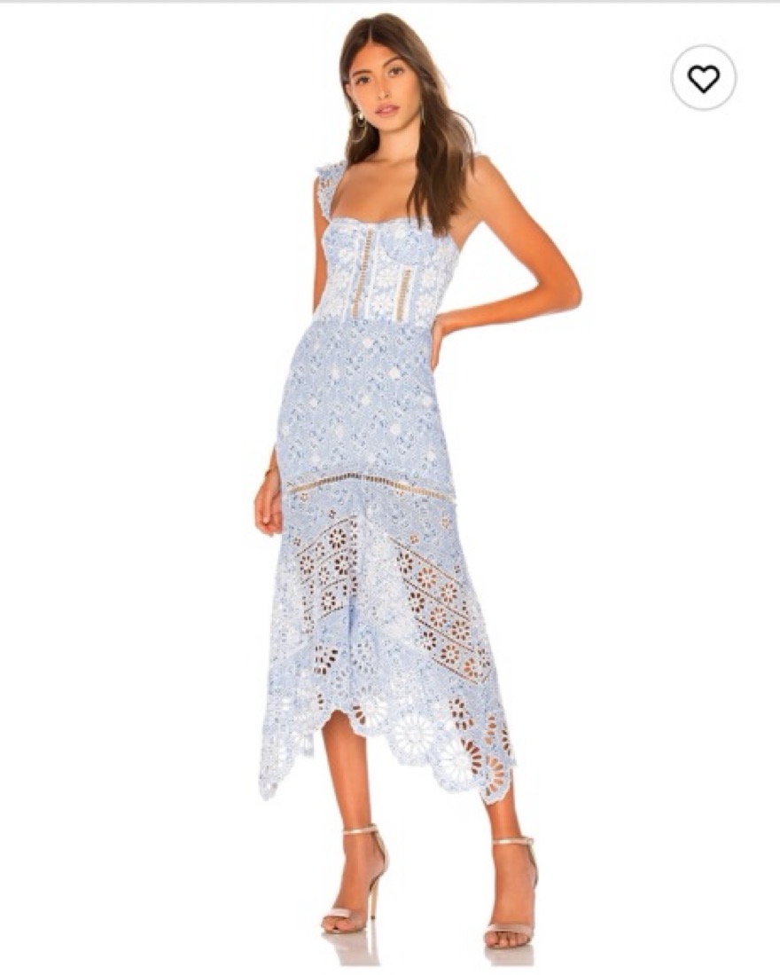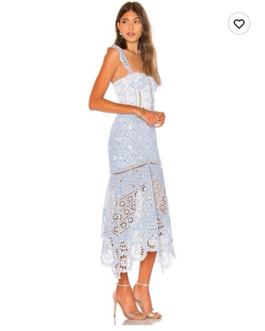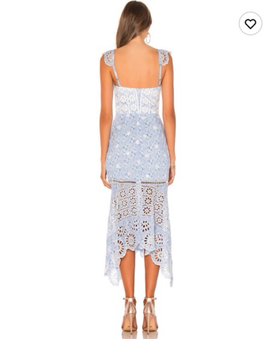 Cotton blend Dry clean only Fully lined Adjustable shoulder straps Underwire bust Allover eyelet fabric with lattice trim Hidden back zipper closure Revolve Style No. KARI-WD374 Manufacturer Style No. 5039E