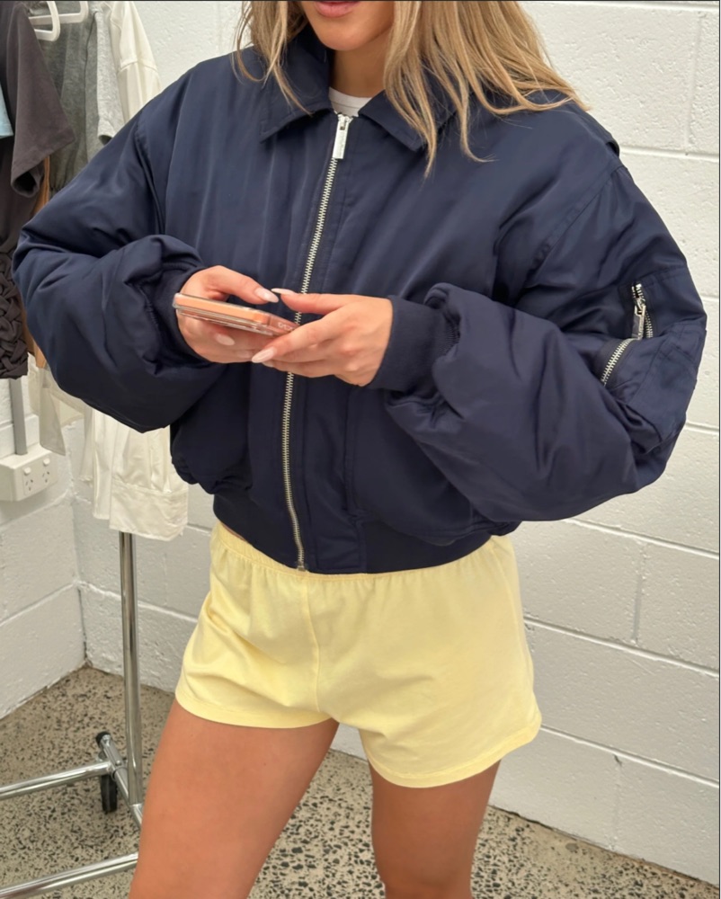 Iconic Bomber Jacket in Navy blue. Size S/M. As seen on Ruby Lyn!!