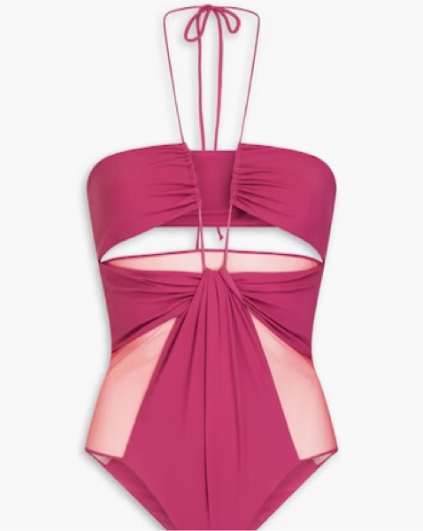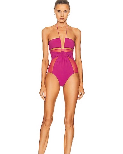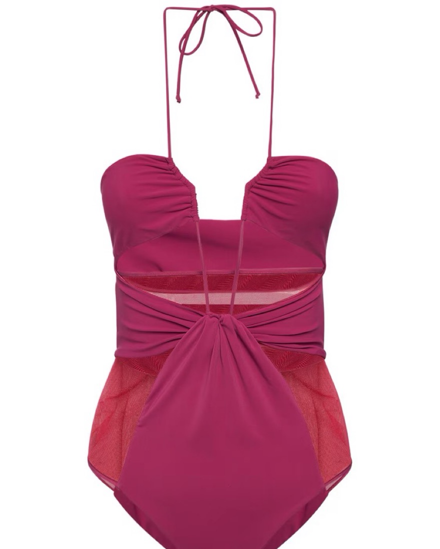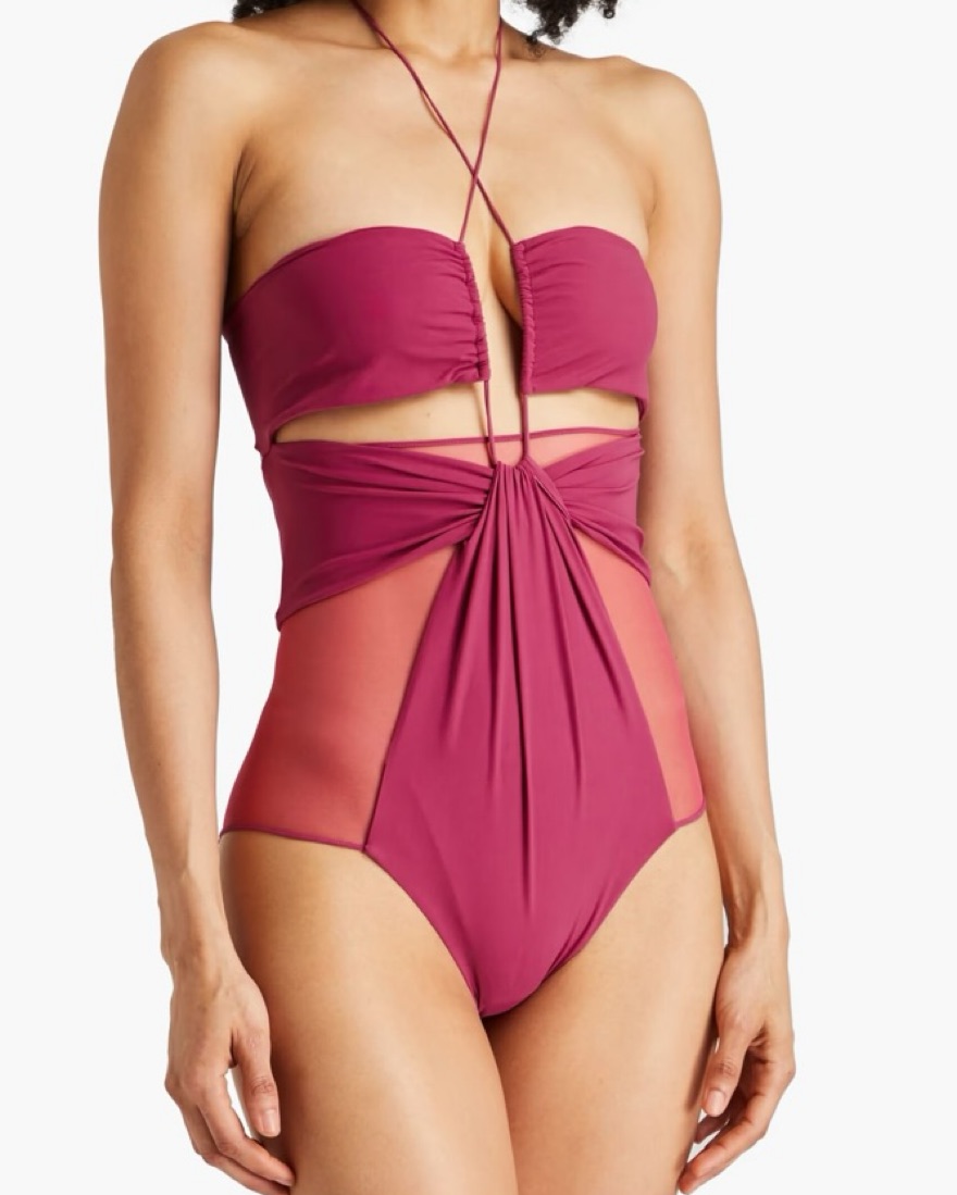 Nensi Dojaka's magenta swimsuit is so striking in both color and cut. It's artfully gathered and detailed with sheer, mesh panels and subtle cutouts for added glamor. I usually wear it as a top for girls nights