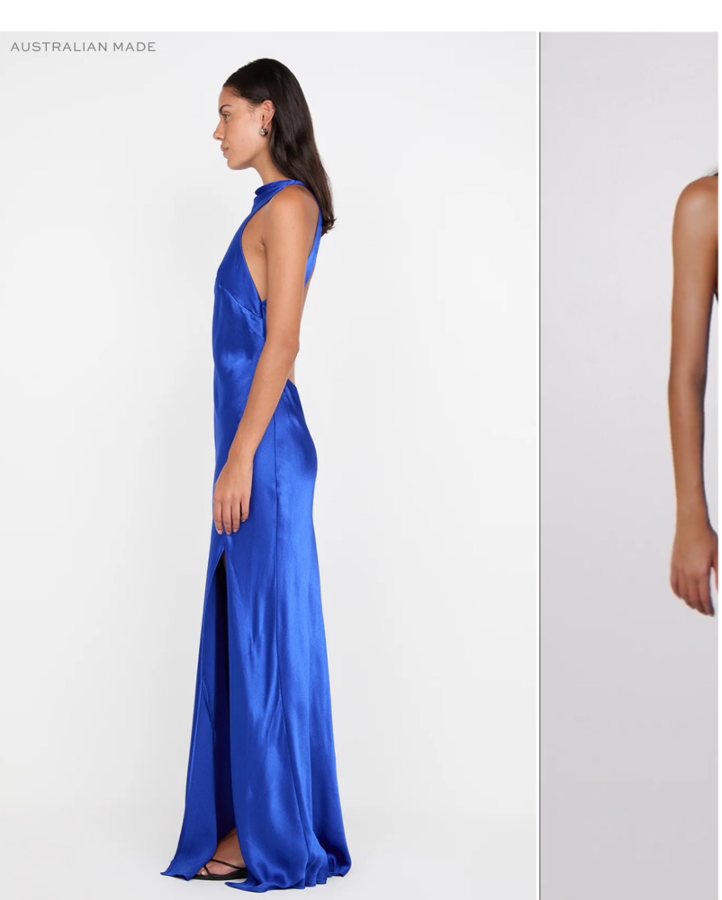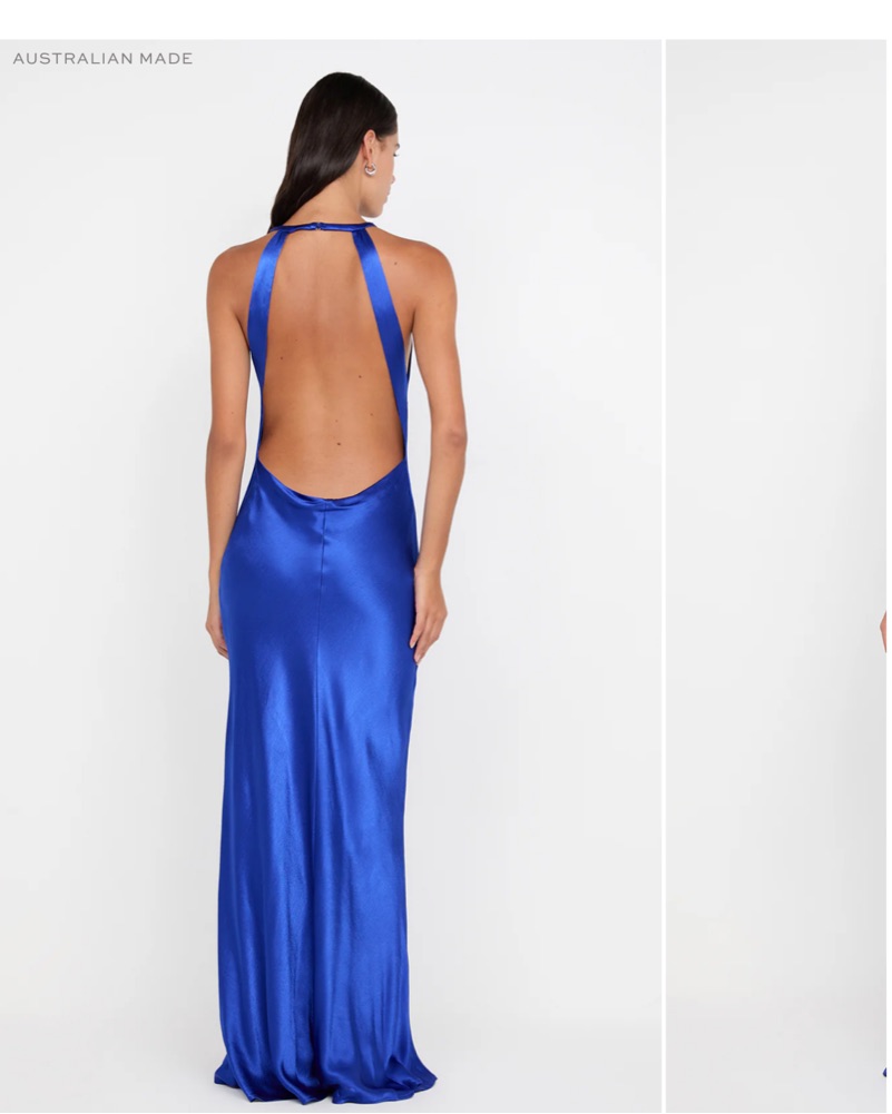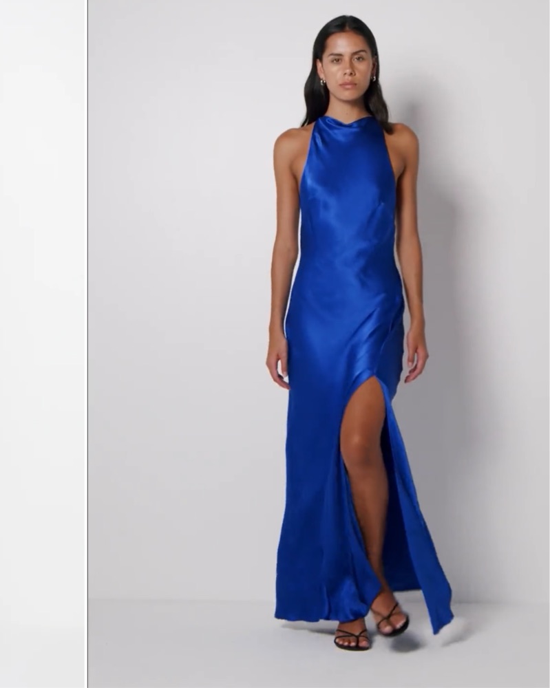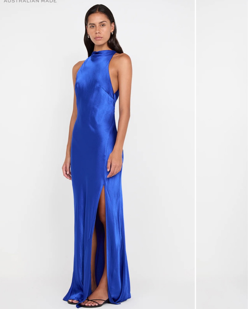 Never worn - This striking cobalt blue satin gown is the perfect choice for a formal event. The sleek silhouette and high slit add an alluring touch of sophistication. I missed the return window.