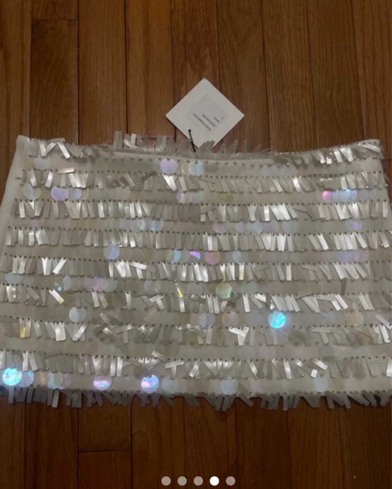Tagged as size S but runs really big so it would probably fit M or even an L the best. Sequin mini skirt.